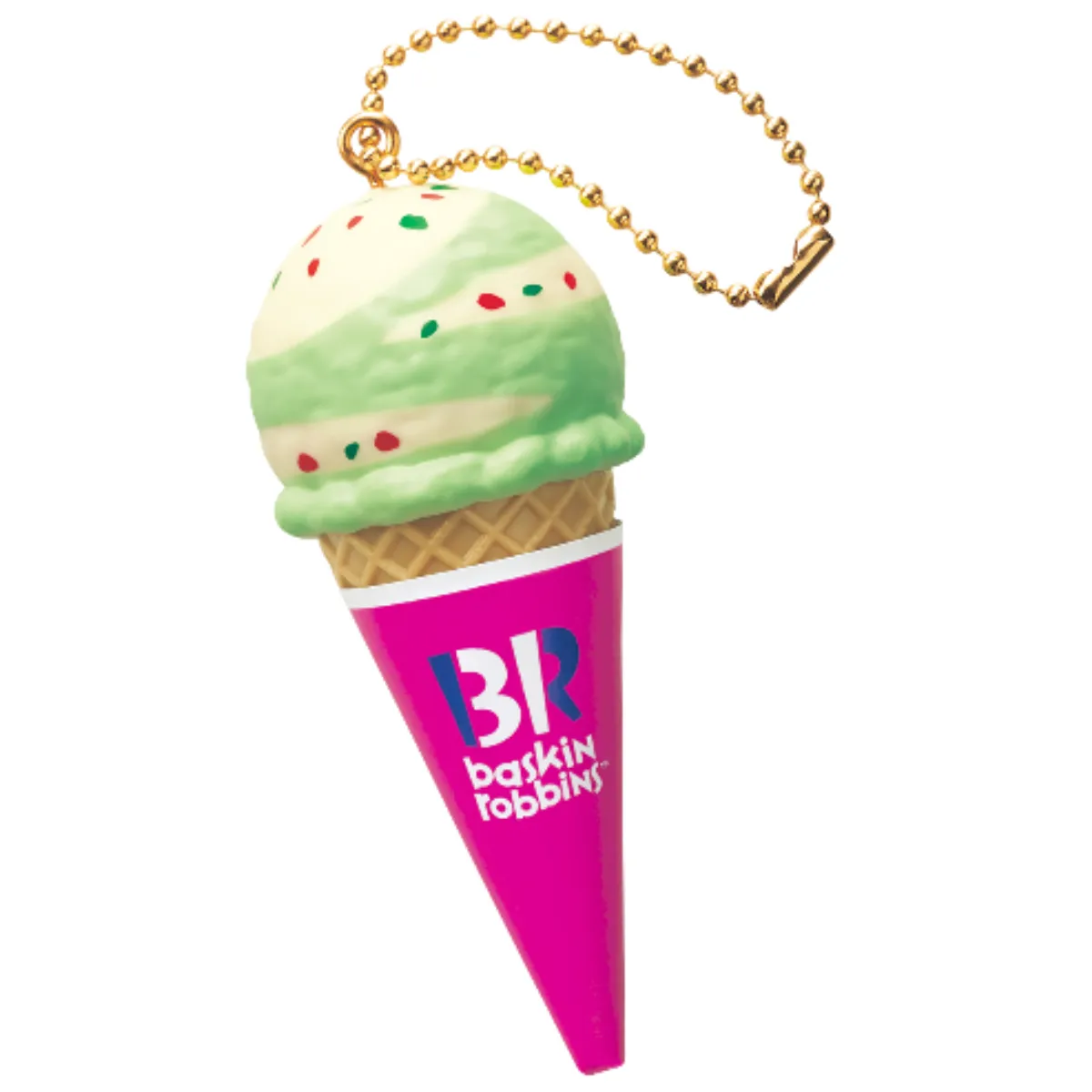 ポッピングシャワーをイメージしたコーン型キーホルダー。ミントグリーンのアイスに赤と緑のチップがちりばめられ、サーティワンの人気フレーバーをそのまま小さくしたようなデザイン。バッグやポーチのかわいいアクセントに。