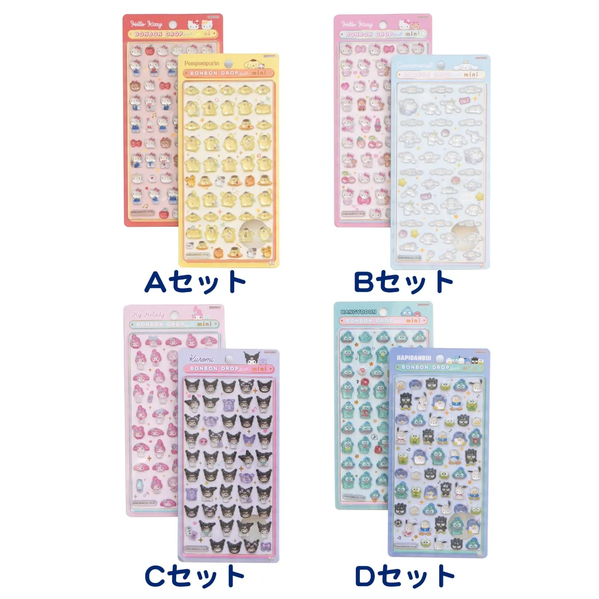 (Aセット:ハローキティレッド、ポムポムプリン / Bセット:ハローキティピンク、シナモロール / Cセット:マイメロディ、クロミ / Dセット:ハンギョドン、はぴだんぶい)