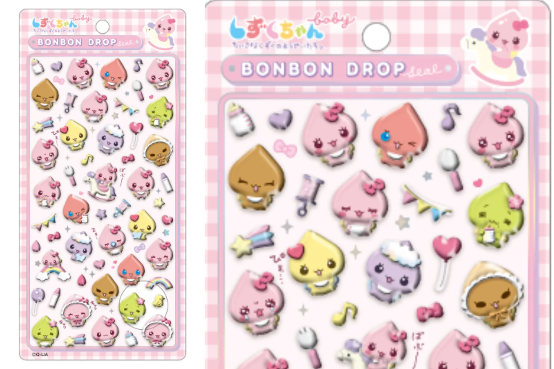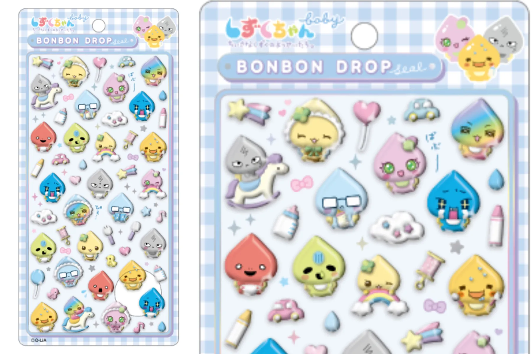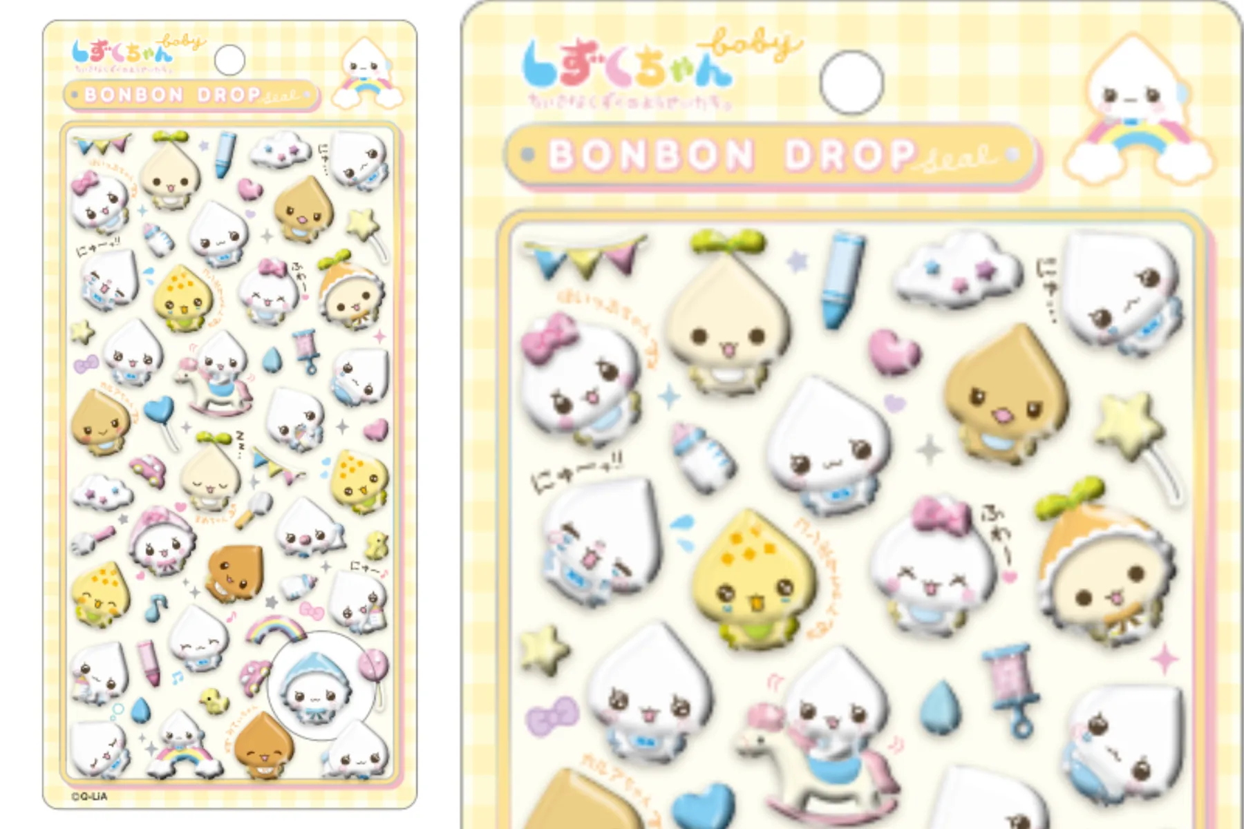 しずくちゃんの仲間たちの赤ちゃん姿がとってもかわいい。ボンボンドロップシールのベビーデザイン。ロッキングホースに乗ったり、天使のような笑顔を見せたり、かわいい赤ちゃんたちが大集合!