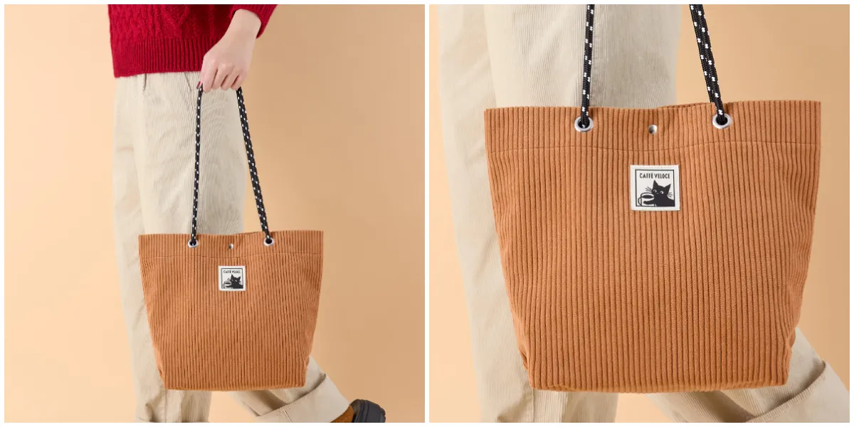 ①黒ねこコーデュロイバック(幅約24cm×奥行約12cm×高さ約28cm 持ち手の長さ約65cm)スモーキーブルー・キャラメルブラウン、シャノアールブラックのうち1種をお選びいただけます。※シャノアールブラックはオンラインストア限定商品となります。