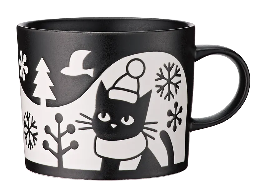 森を散歩する黒ねこが描かれた美濃焼マグ。凹凸のある模様がやさしい立体感を生み、白と黒のコントラストが洗練された印象です。サンタ帽&マフラーを巻いた黒ねこの姿に思わず笑みがこぼれそう。使うたびに手になじむ質感で、温かいドリンクがさらにおいしく感じられそうです。