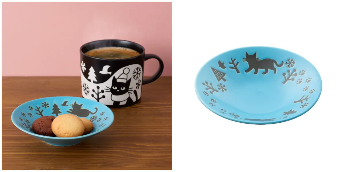 雪景色を思わせる青の器に、猫の足跡や木々をあしらった小皿。お菓子やアクセサリーをのせても映える上品なカラーです。マグカップとセットで使えば、まるで物語の中のワンシーンのよう。食卓に並べるだけで、冬のティータイムが特別な時間に。
