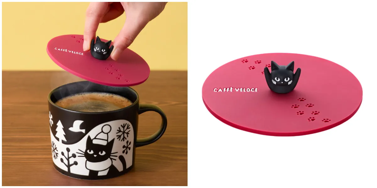 カップの上で雪道に“はまっている”ように見える、ユーモラスな黒ねこのマグカバー。肉球の型押しや「CAFFÈ VELOCE」のロゴがワンポイントになっています。ドリンクの保温やホコリ防止にも役立つ実用派で、デスクワーク中の癒しアイテムにもぴったりです。