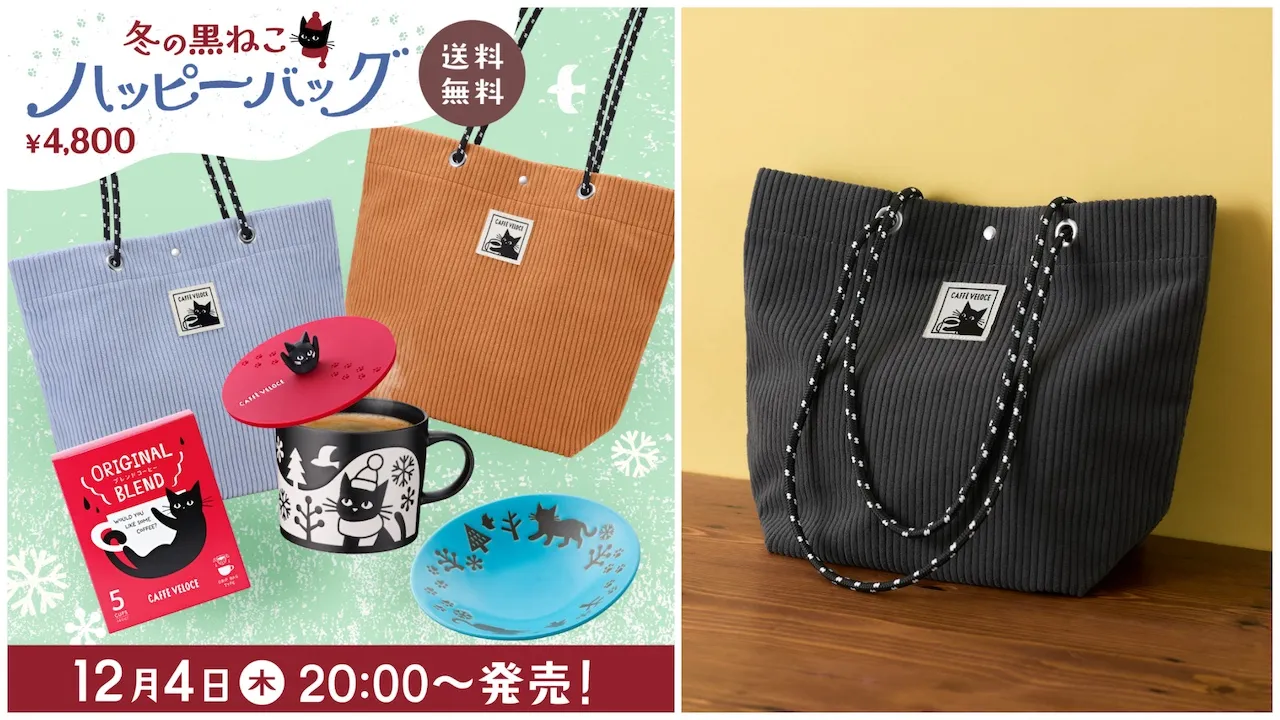 「冬の黒ねこハッピーバッグ2026」は、全国のカフェベローチェ店舗とオンラインストアで12月4日(木)から発売開始。価格は4,800円(税込)で、オンライン限定色のシャノアールブラックも登場します。店舗版はフード引換券付き、オンライン版はドリップバッグ入り。数量限定のため、在庫がなくなり次第終了となります。