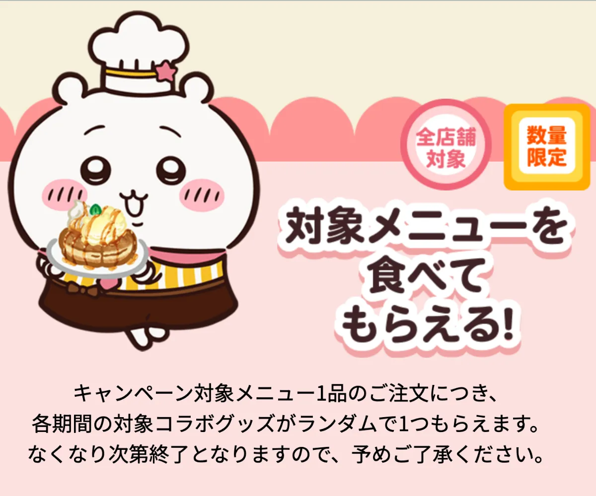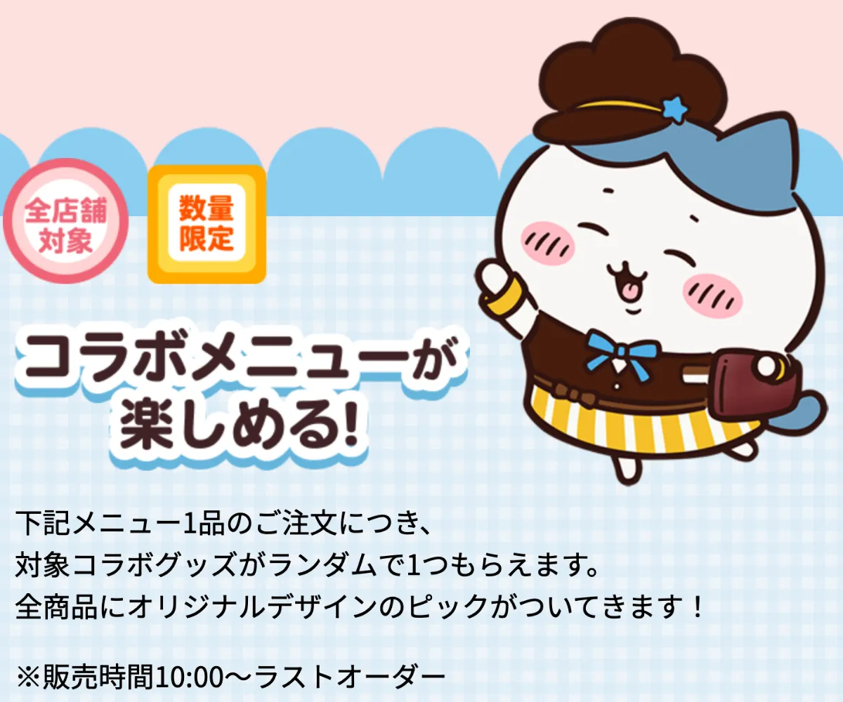 対象メニューを注文すると、制服姿が可愛いちいかわたちの限定イラストを使ったコラボグッズをランダムで1つプレゼント♡ 全4弾でデザインが変わるから、集める楽しさもいっぱい!推しキャラのグッズを揃えたくなる、わくわく企画です♪