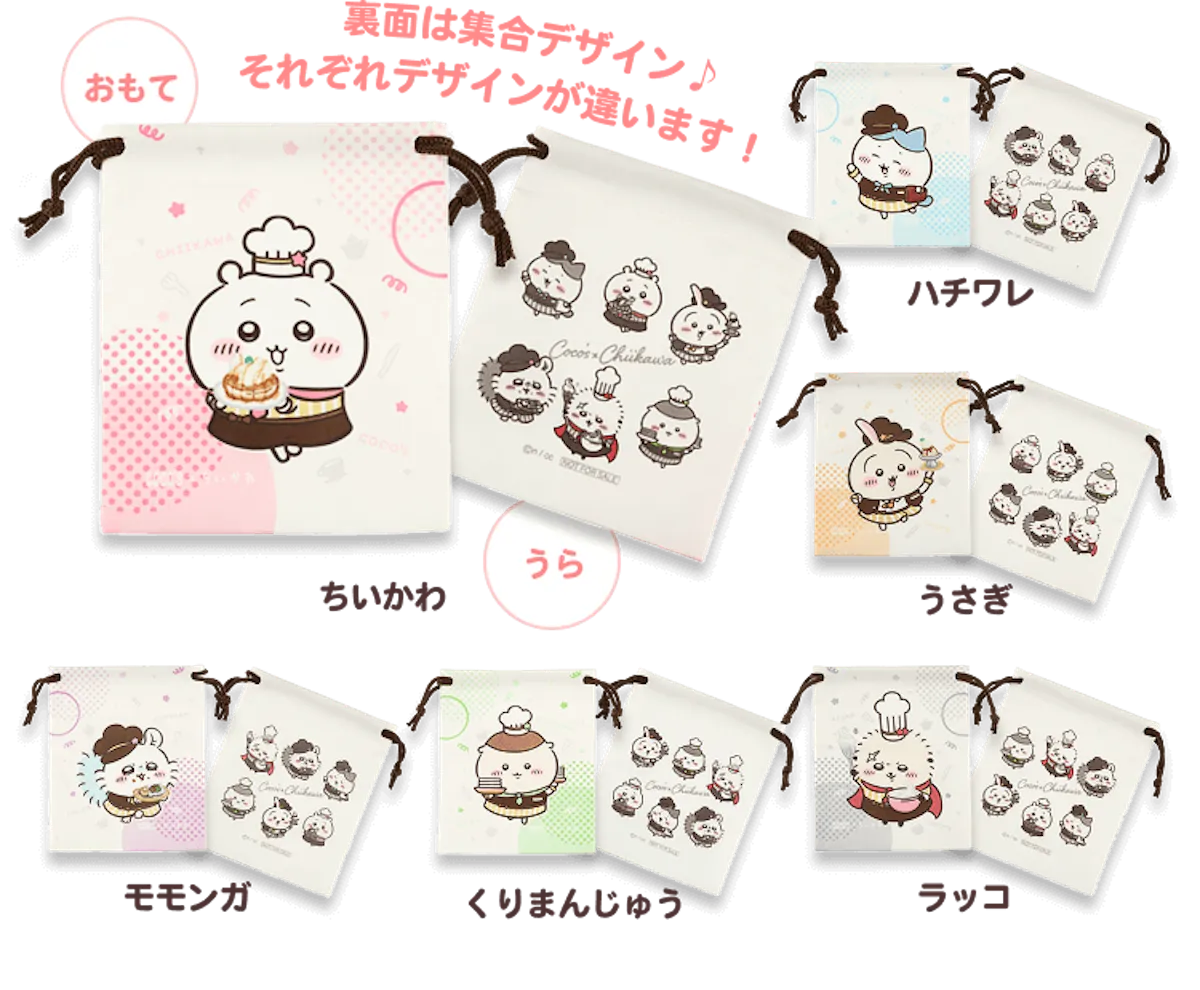 第1弾は巾着!制服姿のちいかわ・ハチワレ・うさぎ・モモンガ・くりまんじゅう・ラッコが描かれた特別デザイン♡ 表はソロ、裏は集合デザインでどれも可愛すぎる〜!全6種のうち1つがランダムでゲットできます♪