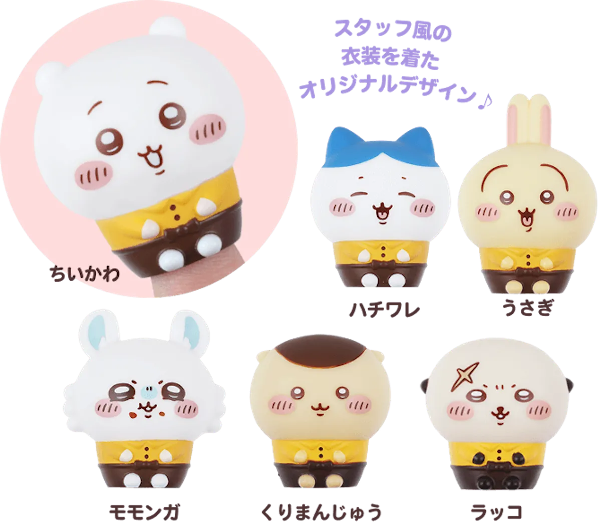 第4弾はミニサイズのソフビ人形。制服姿のちいかわ・ハチワレ・うさぎ・モモンガ・くりまんじゅう・ラッコがちょこんと可愛く立体化♡ 全6種のうち1つがランダムで、並べて飾りたくなる仕上がりです。