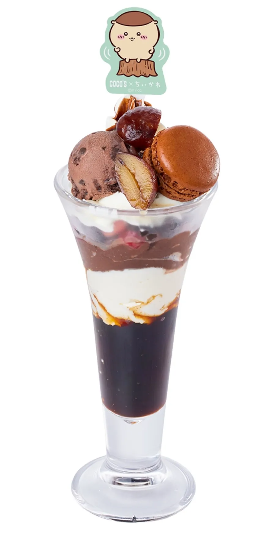 くりまんじゅうの大人っぽさを表現したビターチョコレートパフェ♡ ほろ苦さと甘さが絶妙で、落ち着いた味わいが楽しめます。ちょっぴり渋かわいい雰囲気に、くりまんじゅう推しはきっと胸キュン♪