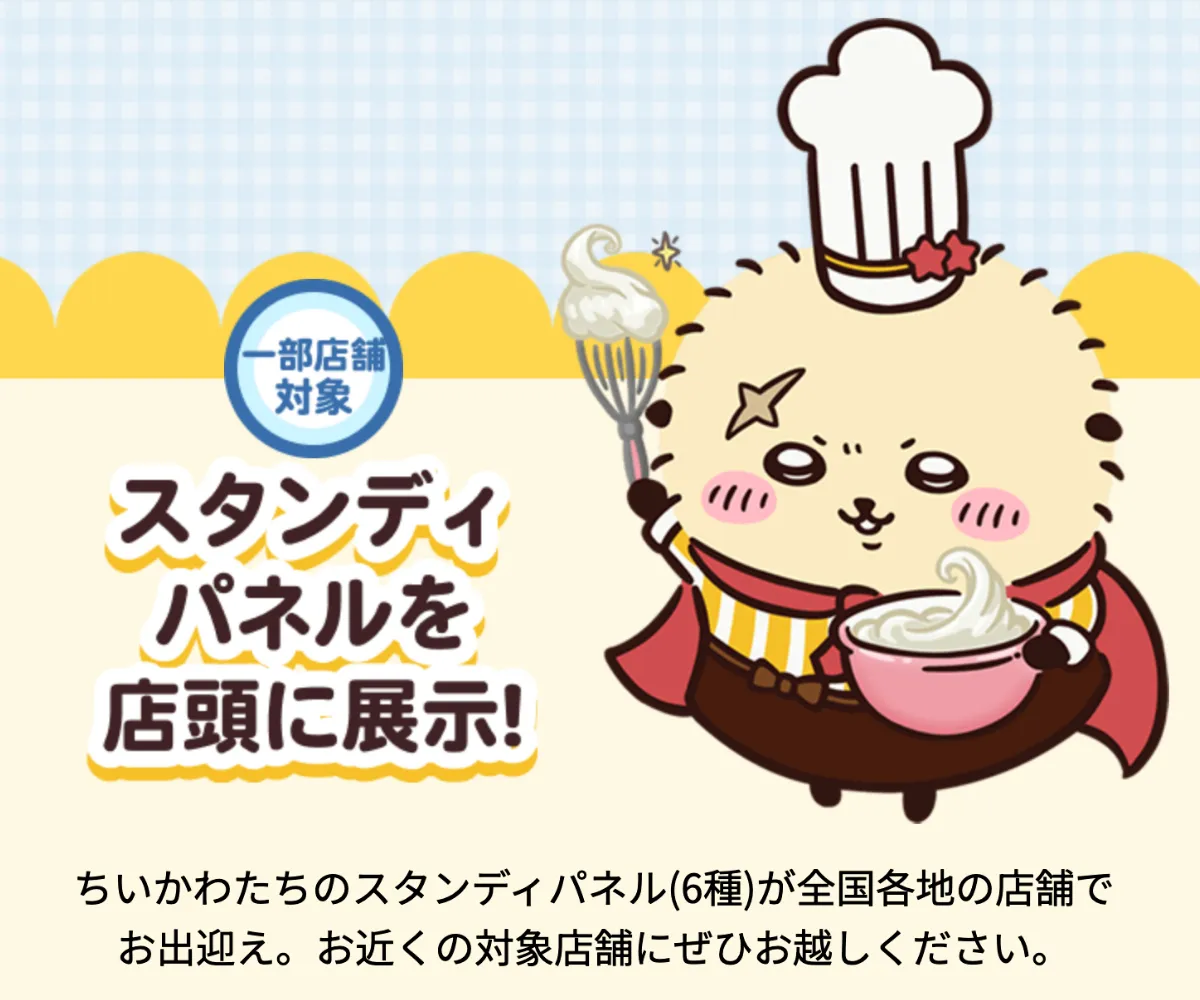 一部店舗にて、ちいかわ、ハチワレ、うさぎ、モモンガ、くりまんじゅう、ラッコのスタンディパネルを展示します。
