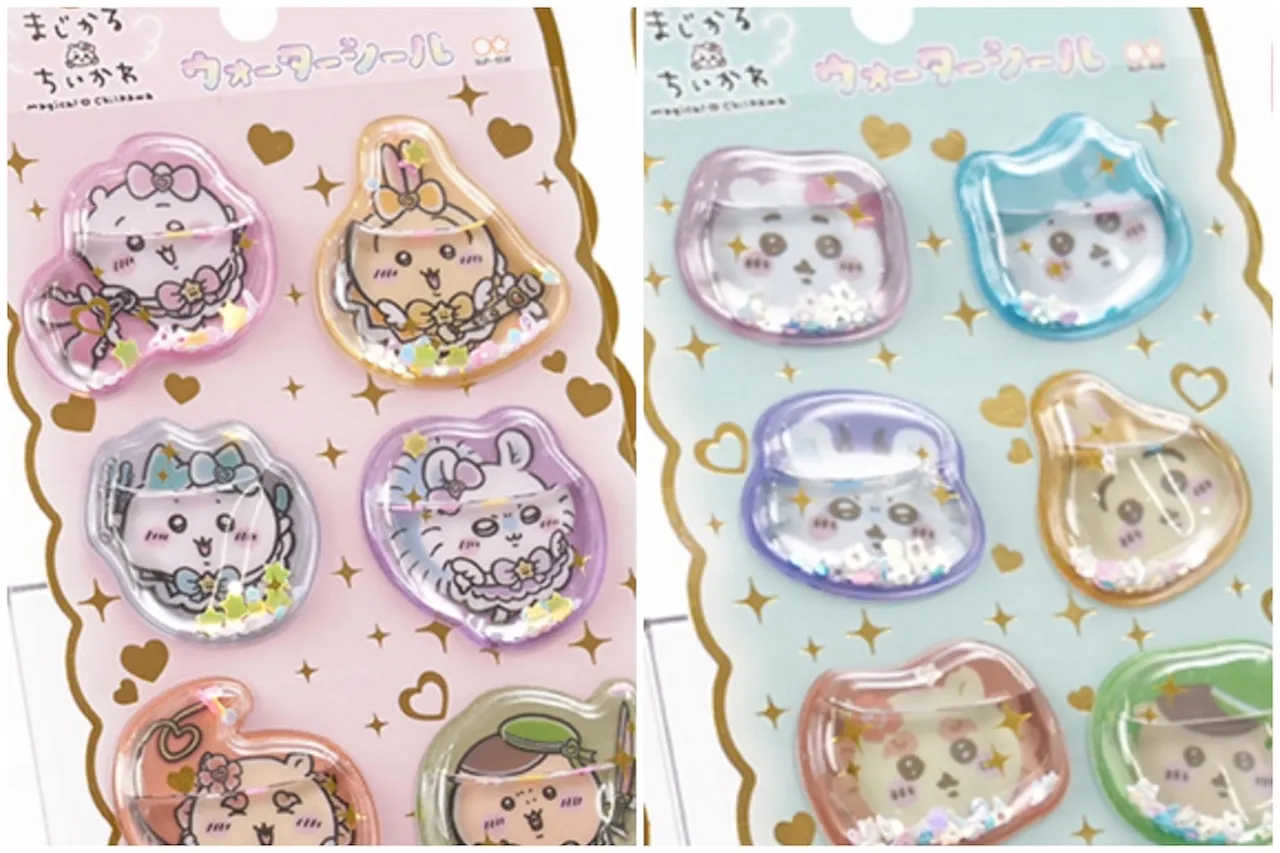 ぷにっとした触り心地と、お水の中でキラキラきらめくモチーフがとってもかわいいウォーターシール。華やかなまじかる衣装に変身中のちいかわたちがとってもキュート。