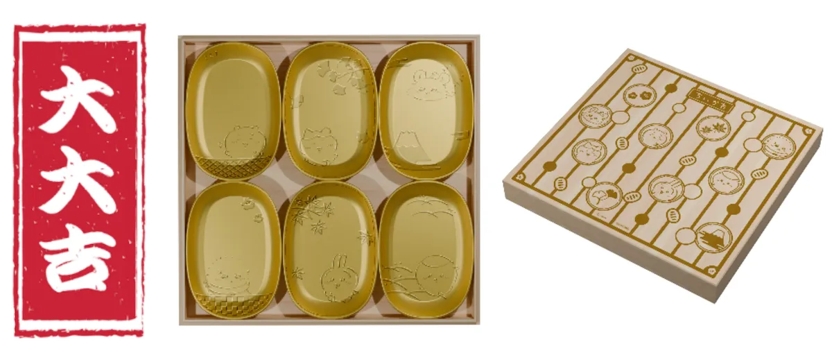 ちいかわたちがあしらわれた、小判風デザインのオリジナル豆皿セット。金色を基調とした華やかな仕上がりで、豆皿6枚が木箱に収められた特別仕様です。
