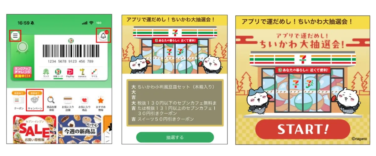抽選への参加方法はとても簡単。セブン‐イレブンアプリ内の対象バナーから進み、「抽選する」「START!」をタップするだけで完了します。結果はアプリ内で確認でき、当選内容に応じてお知らせやクーポンが配信されます。忙しい年末年始でも、スキマ時間に楽しめそうですね。