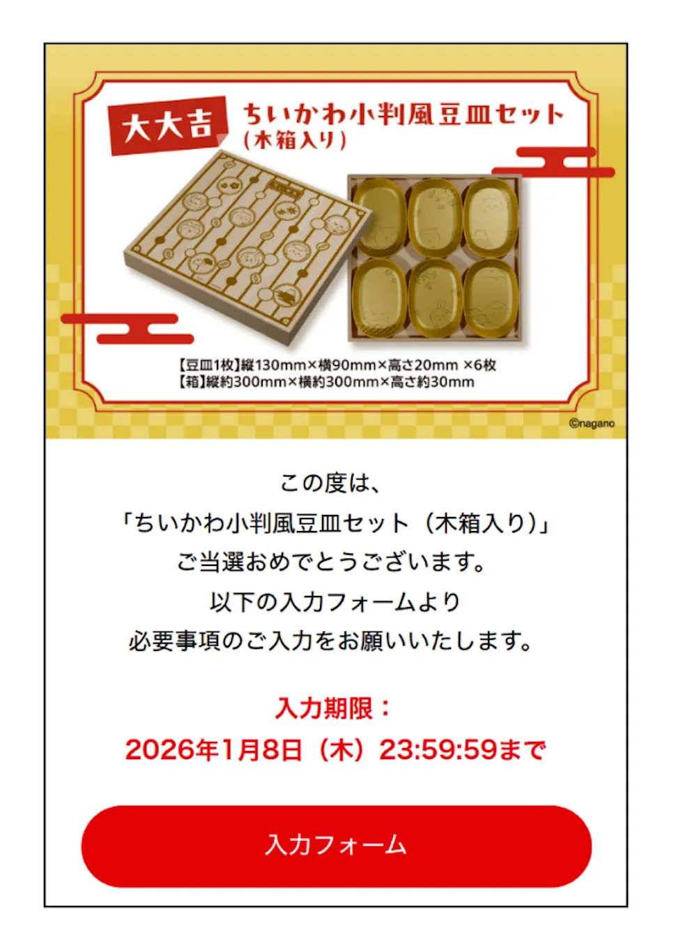 当選した方は、当選後に届くアプリ内のお知らせをタップし、入力フォームにてお客様情報を登録すると、2026年4月下旬以降順次、大大吉賞品「ちいかわ小判風豆皿セット(木箱入り)」が郵送されます。