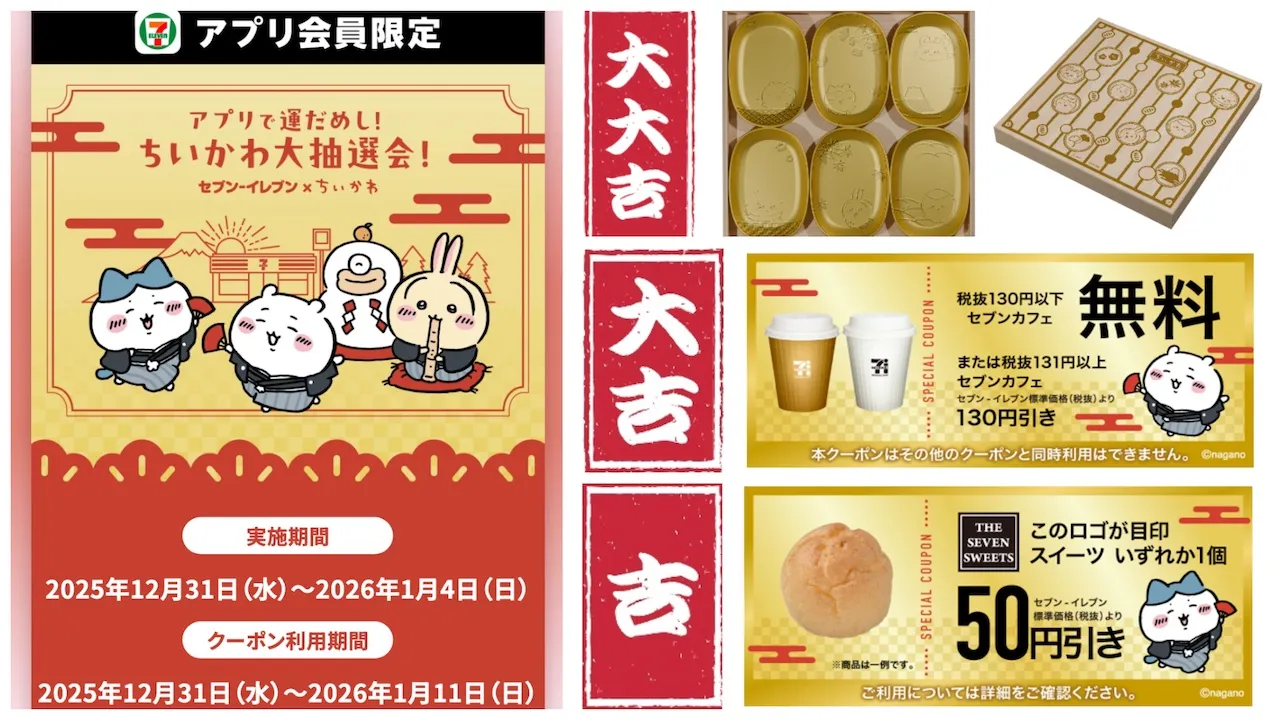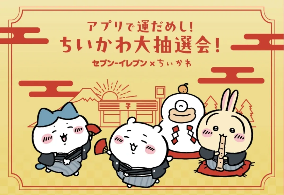 セブン‐イレブンアプリ会員限定で、「アプリで運だめし!ちいかわ大抽選会!」が、2025年12月31日(水)から2026年1月4日(日)の5日間限定で開催されます。