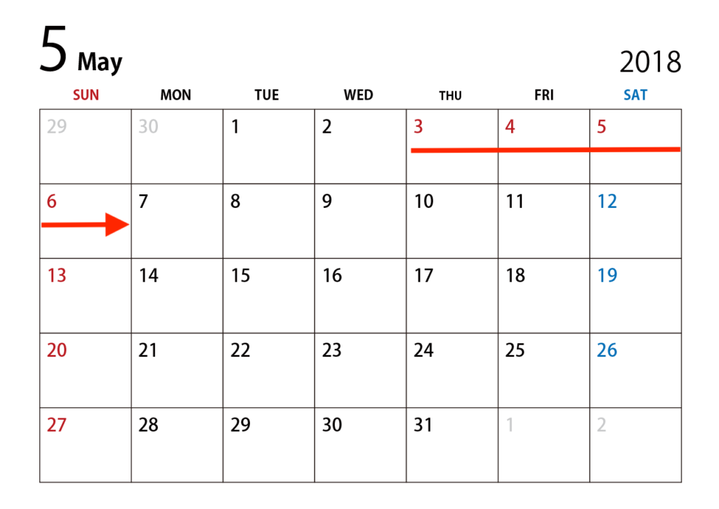 2018年のゴールデンウィークは4月28日(土曜)〜4月30日(月・振替休日)の3日間、5月3日(祝日)〜5月6日(日)までの4日間となります。