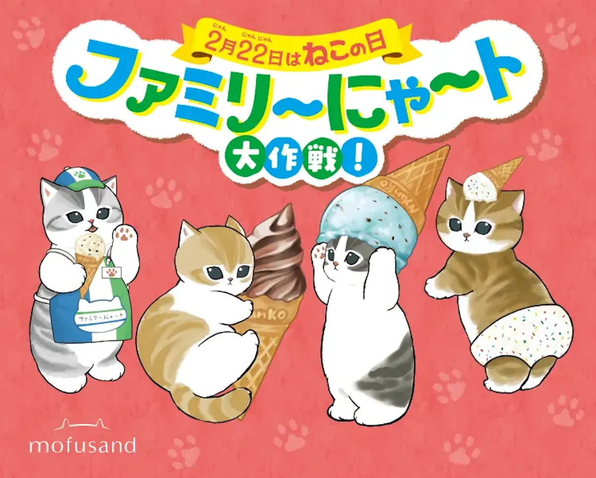 【ファミマ×ねこの日2026】情報!ファミリーマートでは、2026年2月10日(火)より、2月22日の“ねこの日”に向けて「ファミリ~にゃ~ト大作戦!」がスタート!魅力あふれるコラボ企画の中から、2月10日(火)10時からスタートする店頭プレゼントキャンペーンをご紹介。対象のアイスを2個同時に買うと「mofusand」オリジナルアクリルチャームが先着でもらえますので、ぜひチェックしてみてください♪