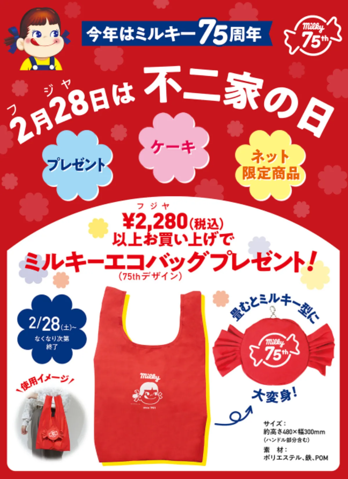 【不二家の日 2026】特集!全国の不二家洋菓子店にて、2026年2月28日(土)の『不二家の日』より、税込2,280円以上お買い上げのお客様に先着で、ペコちゃん柄のミルキーエコバッグ(75thデザイン)がもらえる店頭キャンペーンを実施します。数量限定につき、なくなり次第終了となりますのでお見逃しなく。
