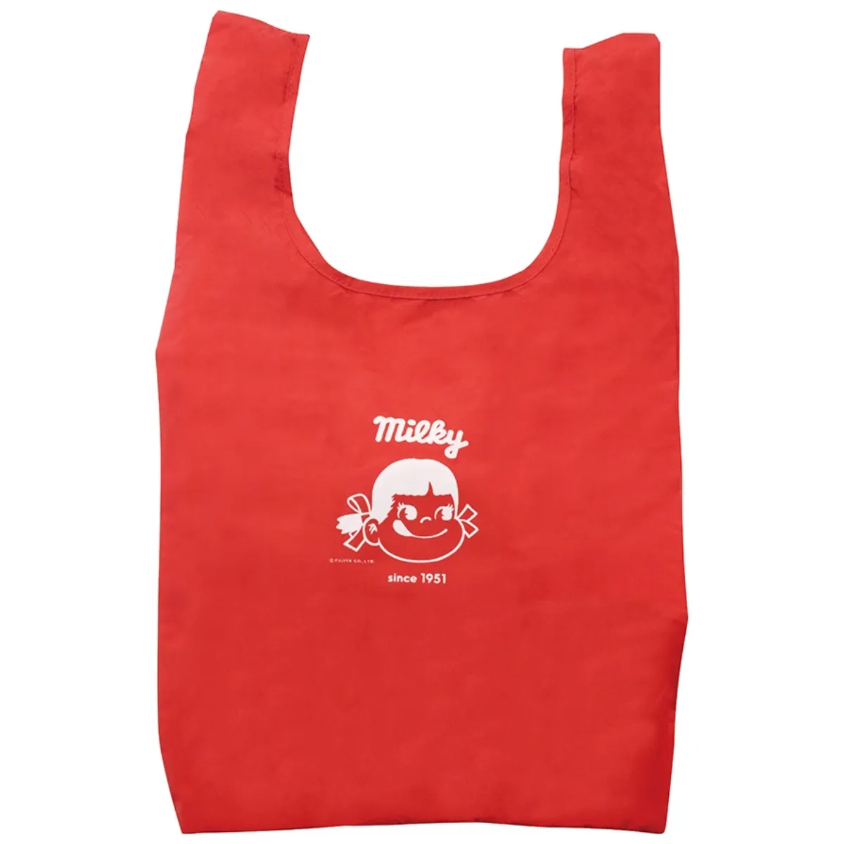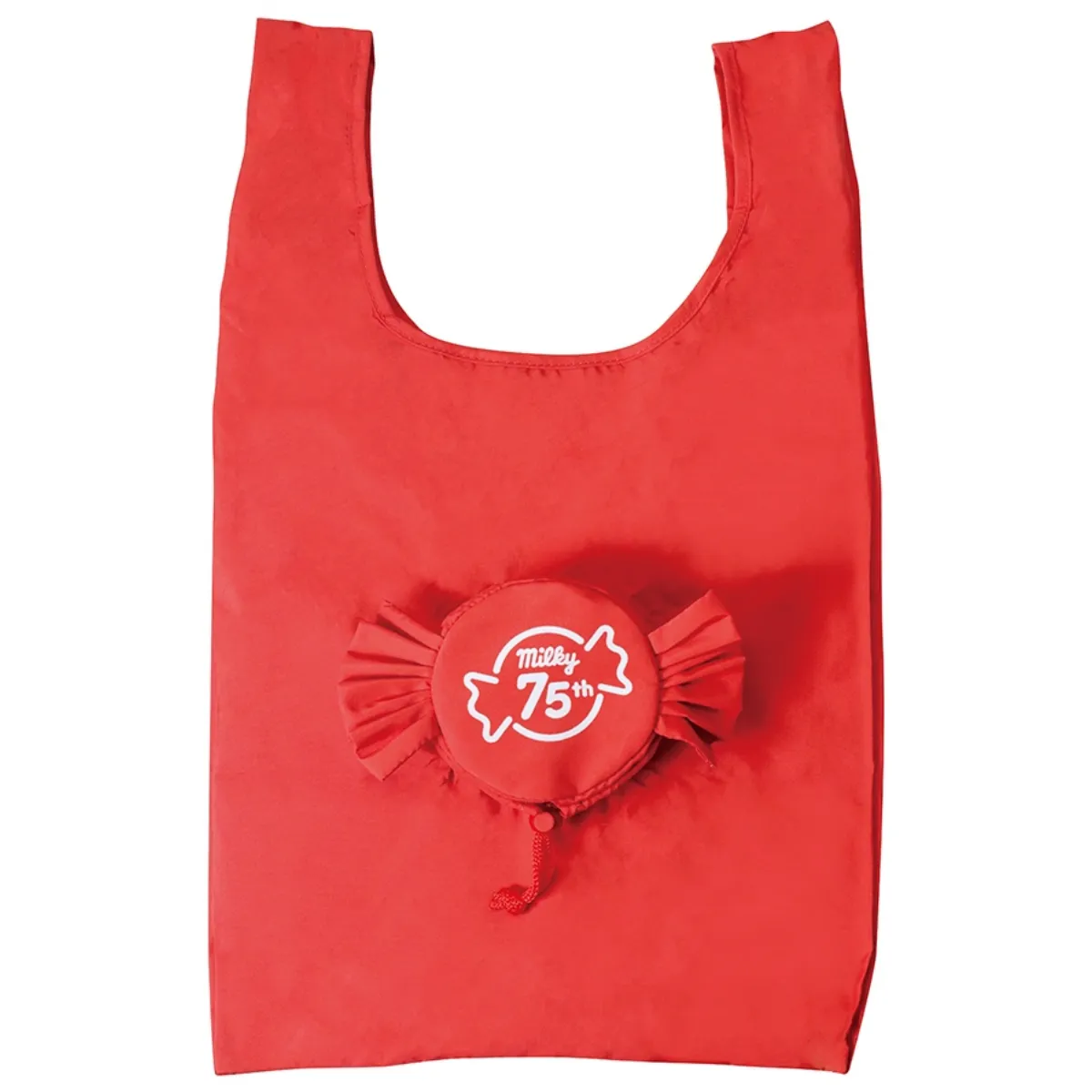 華やかなレッドカラーに、立体的なミルキーモチーフが映える、75thデザインのオリジナルエコバッグ。