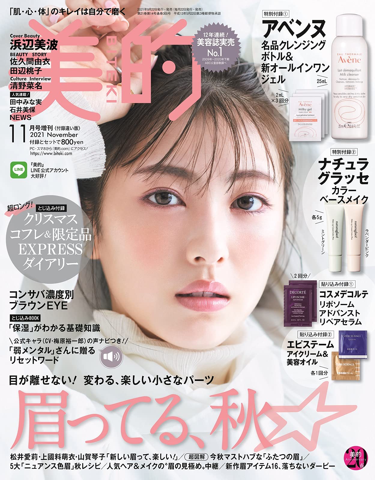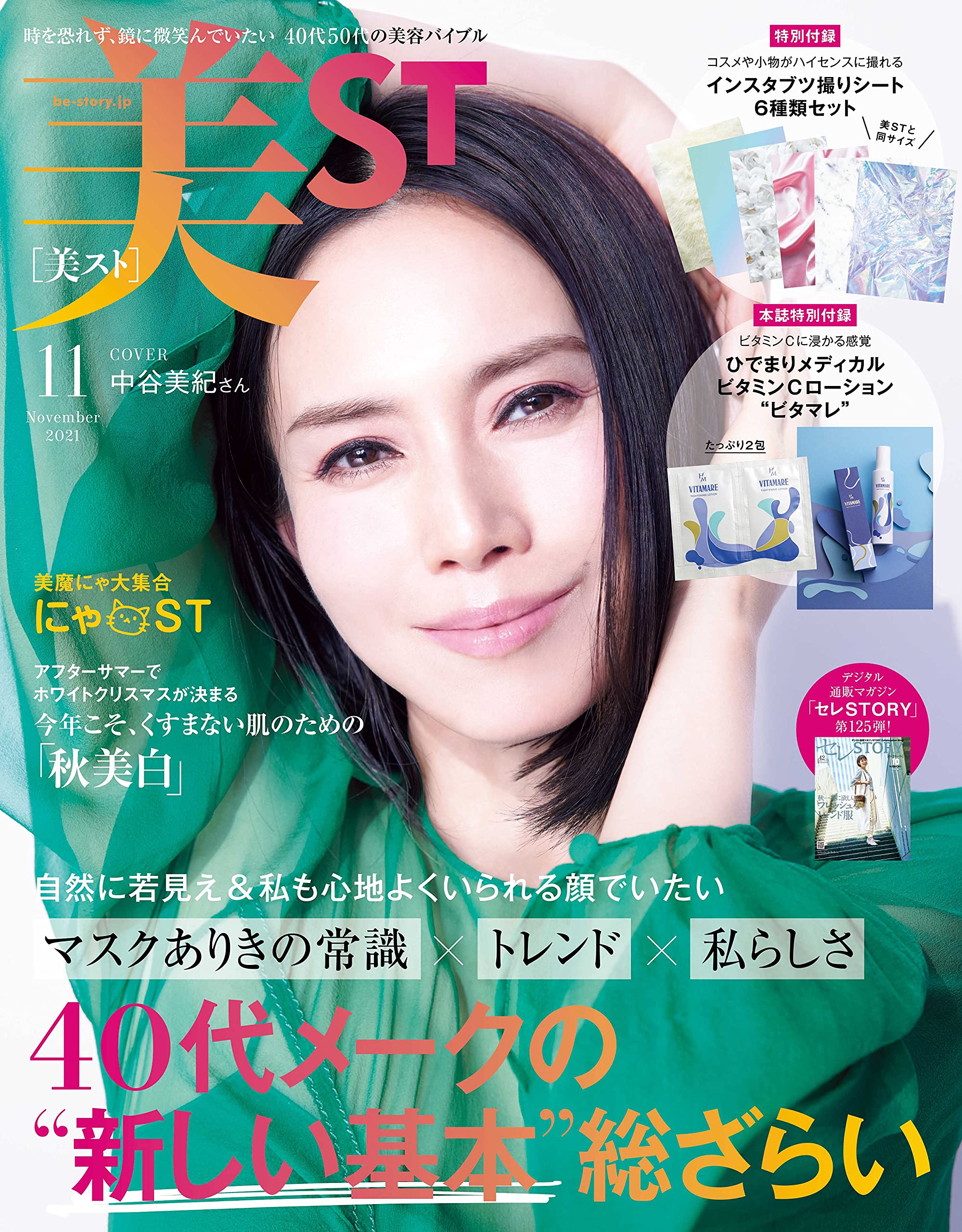 美ST(美スト)2021年11月号の雑誌付録は、インフルエンサー超え!インスタ物撮りシート6種類セットに加え、ひでまりメディカル ビタミンCローション「ビタマレ」(たっぷり2包)が登場です。
