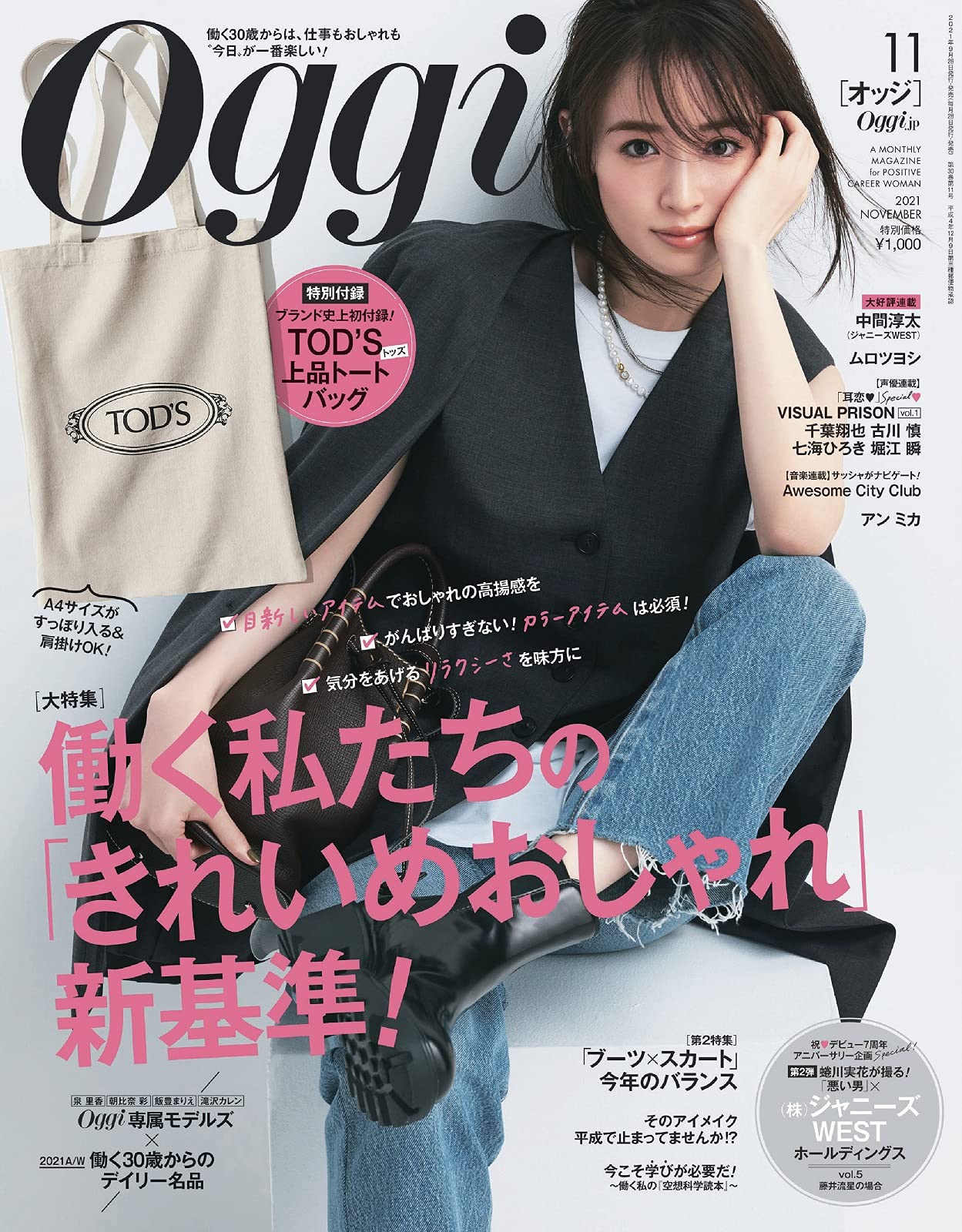 Oggi(オッジ) 2021年11月号の雑誌付録は、イタリアの高級ファッションブランド「TOD'S(トッズ)」のブランド史上初付録となる、肩掛けもできるリネン風のトートバッグが登場です。