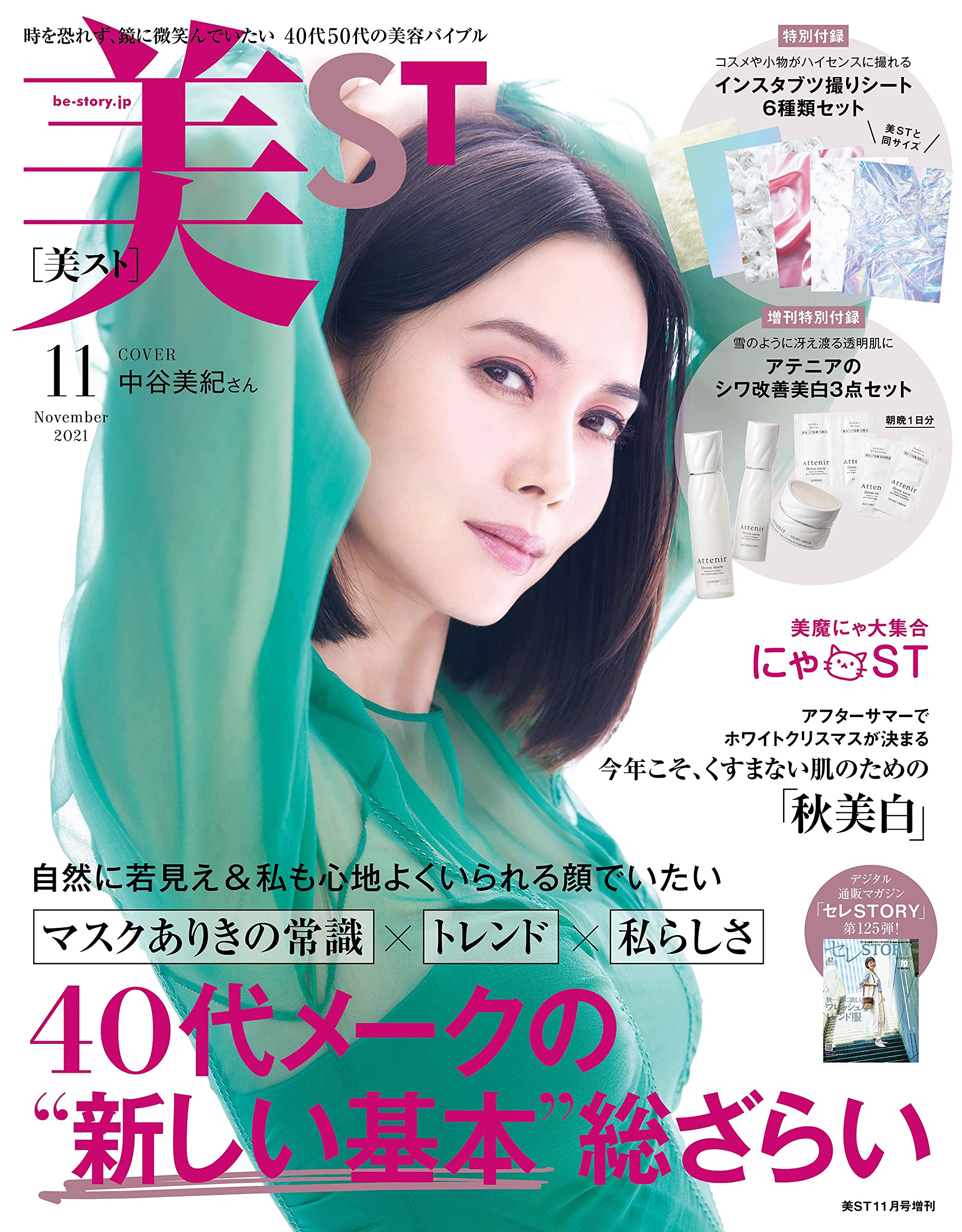 美ST(美スト)2021年11月号の雑誌付録は、インフルエンサー超え!インスタ物撮りシート6種類セットに加え、アテニア シワ改善美白3点セット(朝夜1日分)の登場です。