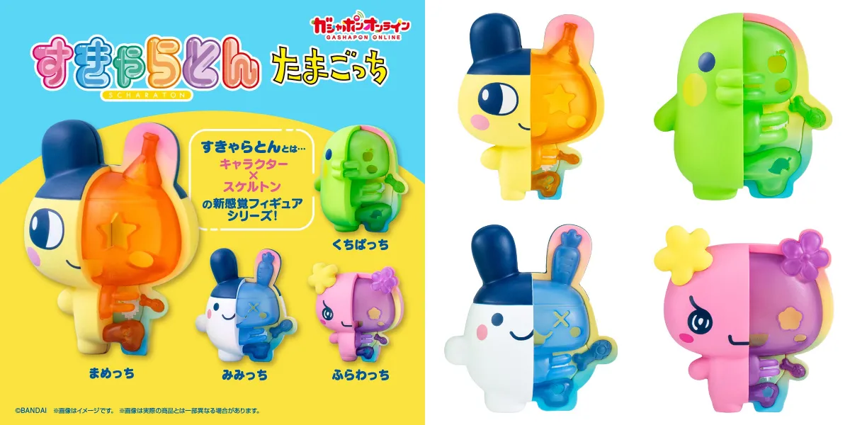 全国各地で売り切れ続出の「たまごっち」ガシャポンに、新作の「すきゃらとん たまごっち」が仲間入り。すきゃらとんとは、キャラクター×スケルトンの新感覚フィギュアシリーズ。まめっちたちが半身スケルトンになったキュートで少し不思議なフィギュア。たまごっちならではのかわいい骨のデザインに注目☆
