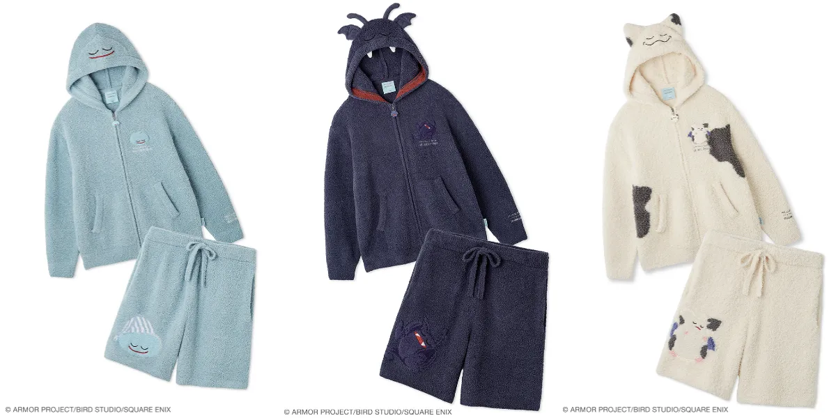 ふわふわ素材で仕立てた「スライム」「ドラキー」「モーモン」のなりきりパーカ&ハーフパンツ。おやすみ顔のスライム、すやすや眠るドラキー、にっこり寝顔のモーモンが愛らしく表現され、羽織るだけで一緒に眠っている気分に。ユニセックスサイズでおそろいも叶う、ファン必携の特別アイテムです。