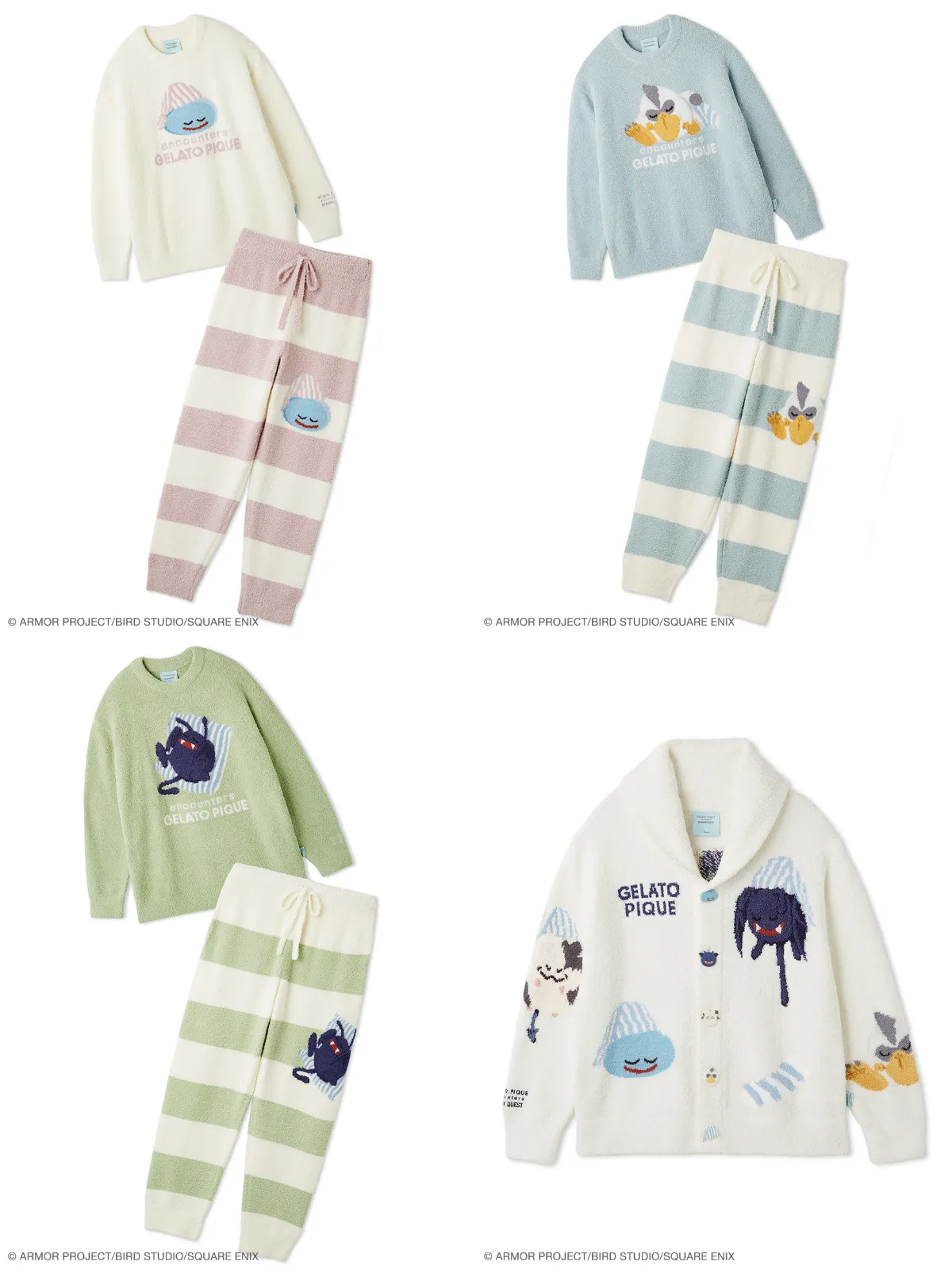 「スライム」「ドラキー」「ももんじゃ」が夢の中にいるような表情をデザイン。淡いボーダー柄のパンツと合わせたセットは、柔らかな風合いでずっと触れていたくなる心地よさ。色違いで揃えれば、家族や友達とリンクコーデも楽しめます。