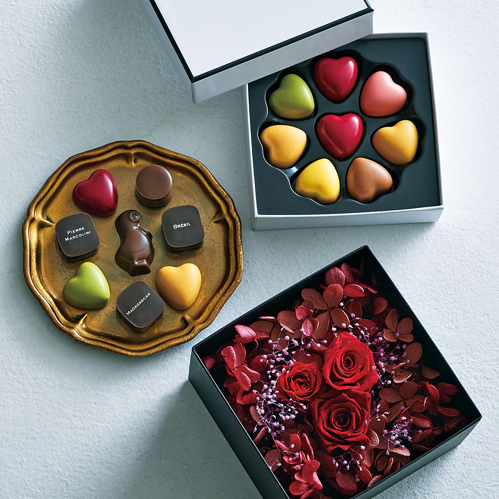 美しいチョコレート16粒と華やかなプリザーブドフラワーのセットは、バレンタインはもちろん、大切な記念日の贈り物にもぴったり。ラグジュアリー感あふれる洗練されたプレゼントで、心に残るひとときを演出してみませんか。