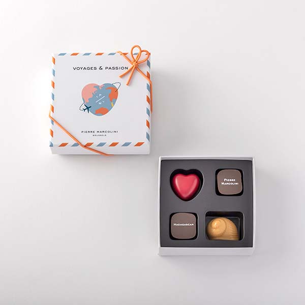 スクエア型のパッケージがかわいい「バレンタインセレクション 4個入り」。旅をイメージしたキュートなパッケージに、赤く美しい一粒「クールフランボワーズ」など、ブランドを象徴するチョコレートが詰め込まれています。洗練された贅沢なプチギフトにぴったり。