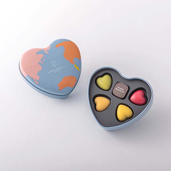 バレンタインシーズンに毎年完売人気!可愛らしいハート缶が今年も登場。2022年は「VOYAGE&PASSION」をテーマに、マルコリーニの上質なカカオを探求する航海と情熱をハート缶に表現。自然由来のナチュラルな色合いにリニューアルしたハート型のチョコレート「クールシリーズ」や、代表作の「ピエール マルコリーニ グラン クリュ」など、個性の異なるプラリーヌを堪能できます。