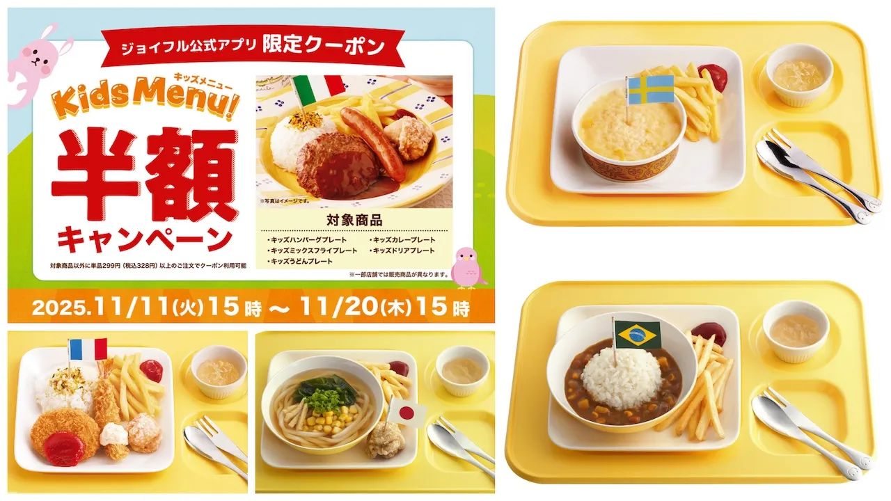物価高が続く中、ジョイフルが子育て世帯を全力で応援!11月11日(火)15時から「キッズ半額キャンペーン」がスタートします。対象のキッズメニュー5品が、アプリクーポンの提示で何度でも半額に。お得なこの機会をお見逃しなく☆