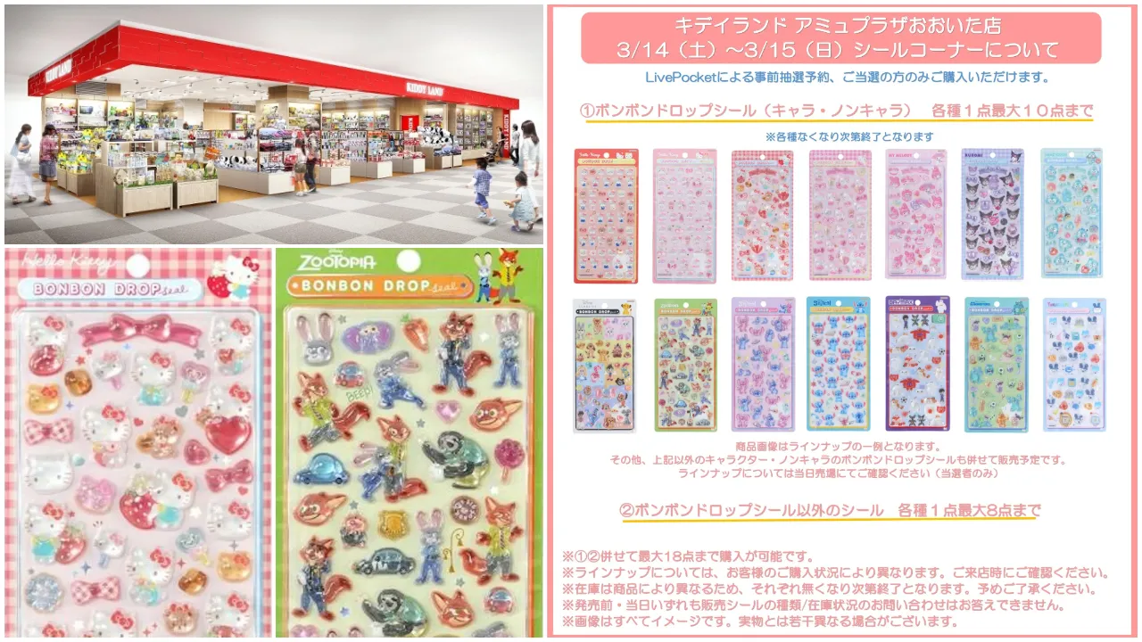 大分県近郊のシール好きさん集まれ〜!かわいいキャラクターグッズに出会える雑貨店「キデイランドアミュプラザおおいた店」にて、2026年3月14日(土)・3月15日(日)に、ボンボンドロップシールを含む「シールコーナー」が登場!入場はライブポケットによる事前抽選予約制となります。気になる商品ラインアップや抽選エントリー方法などを詳しくご紹介しますので、ぜひチェックしてみてください。