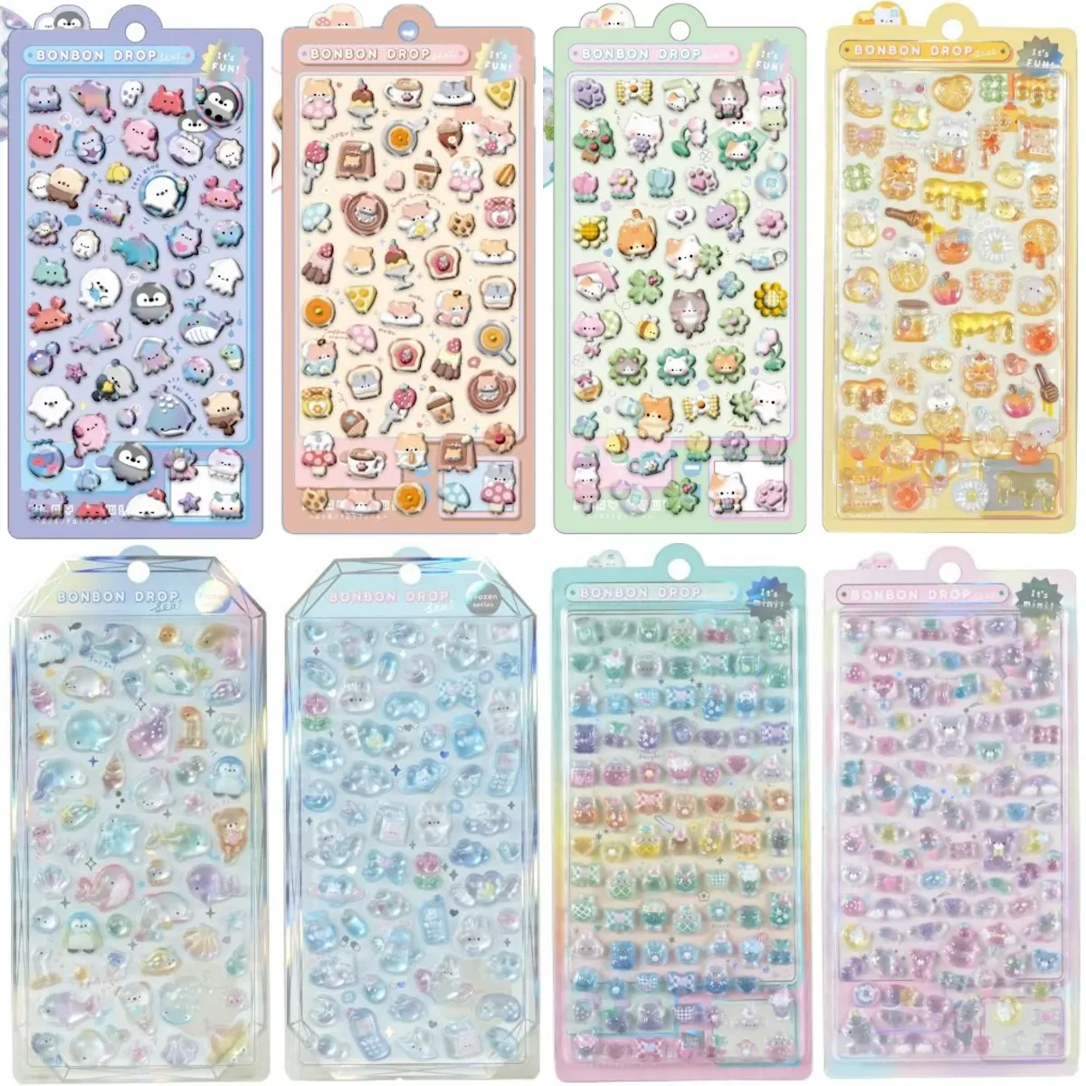 ぷっくりつやつや大人気のボンボンドロップシールから、クーリアオリジナルデザイン。ころんとしたフォルムの海の人気者たちがキュートな「ぷかぷかボンボン」から、スマホやネイルパーツにも便利に使える「ミニサイズ」まで、8種類がラインアップ!