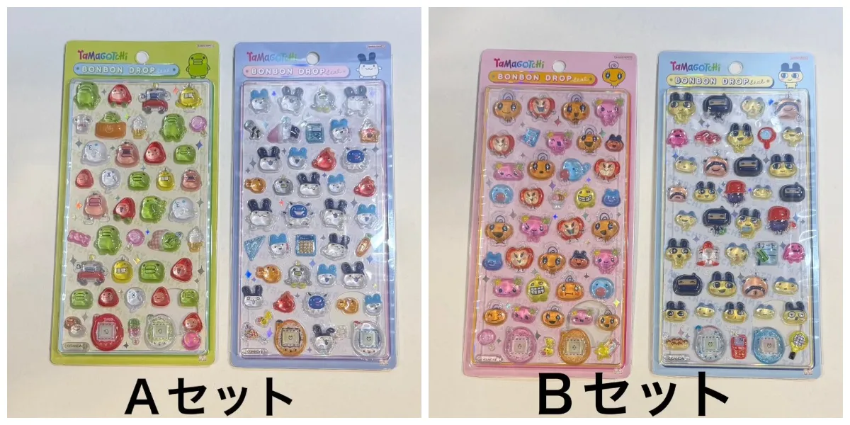 ボンボンドロップシール「たまごっち」は、2種1セットの抽選販売となります。Aセット・Bセットのうち、どちらか片方のみ応募できます。