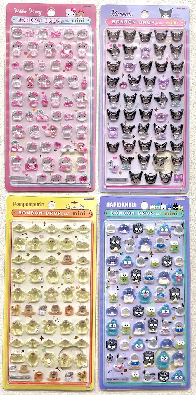 「ボンボンドロップシール サンリオmini」の抽選販売として、ハローキティピンク・クロミ・ポムポムプリン・はぴだんぶいのかわいい4種類がラインアップ!