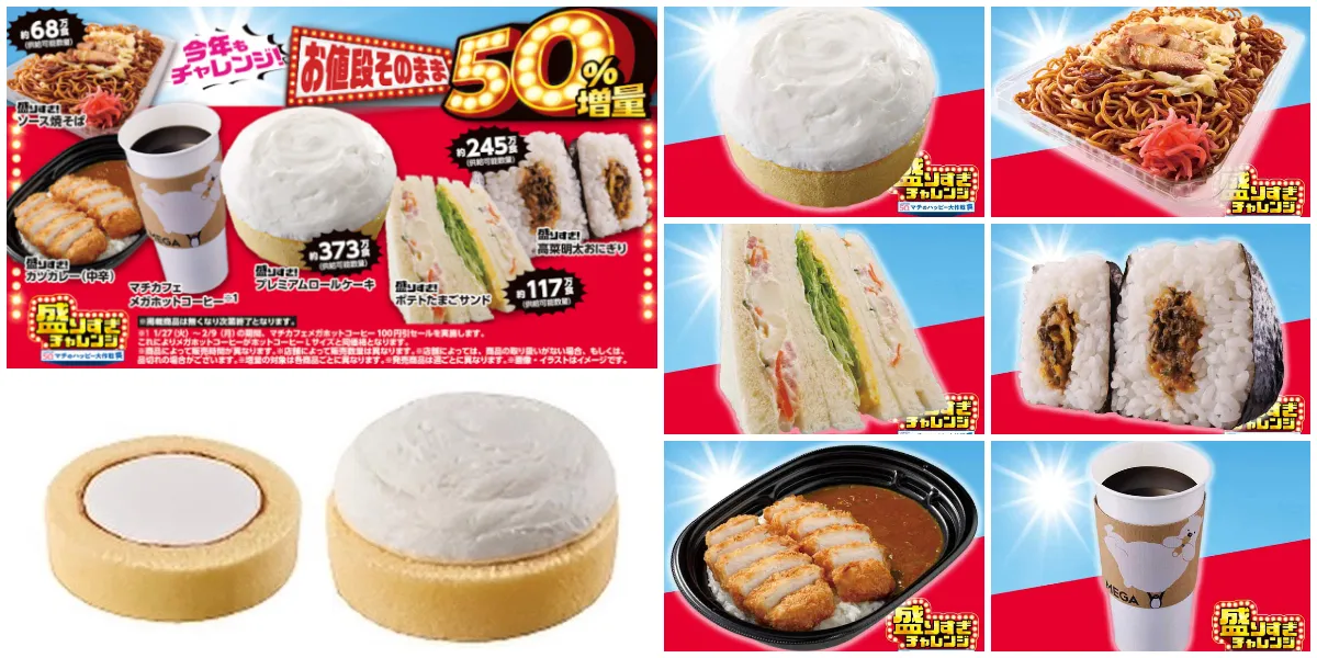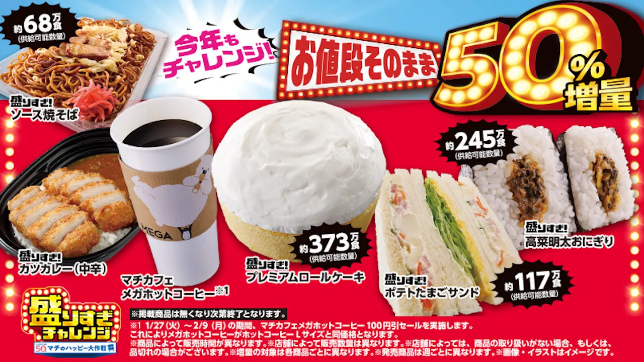 全国のローソン店舗(約14,000店:2025年12月末時点、一部店舗を除く)で、価格据え置きで具材や重量などを約50%増量した、おにぎり・調理パン・調理麺・店内調理弁当・デザートなど計35品を「盛りすぎチャレンジ」として発売します。