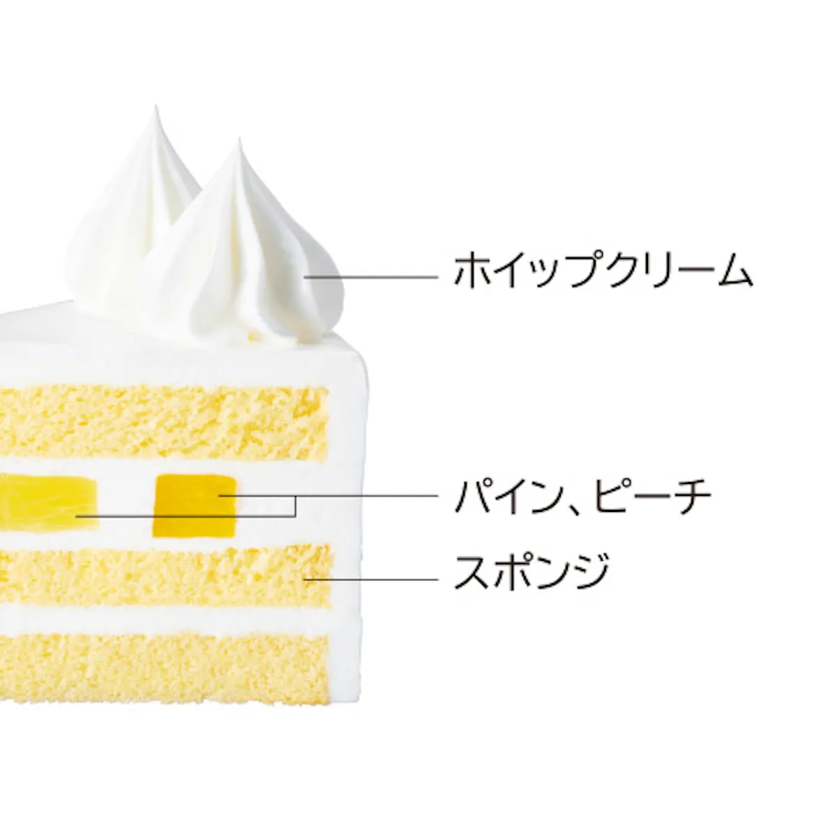 ふんわりスポンジに、ホイップクリームとピーチ・パインを合わせた爽やかなレイヤー。フルーツの明るいアクセントで最後まで軽やかに楽しめそう。お酒は不使用だから、家族みんなでシェアしやすいのもうれしいポイントです。