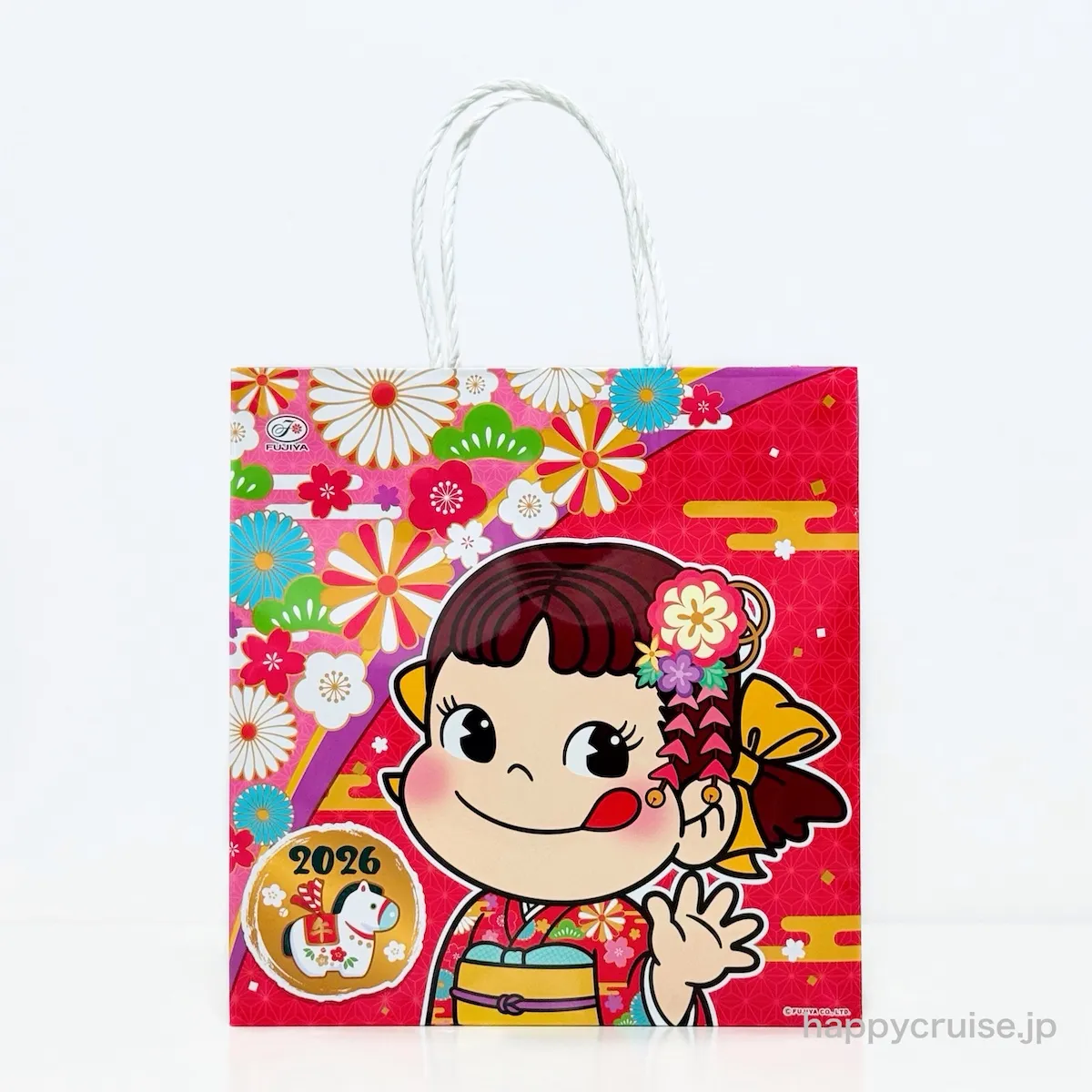 アフターユースに使いたくなる可愛さのペコちゃんの手提げ紙袋。初詣のサブバッグにも活躍してくれそうですね。