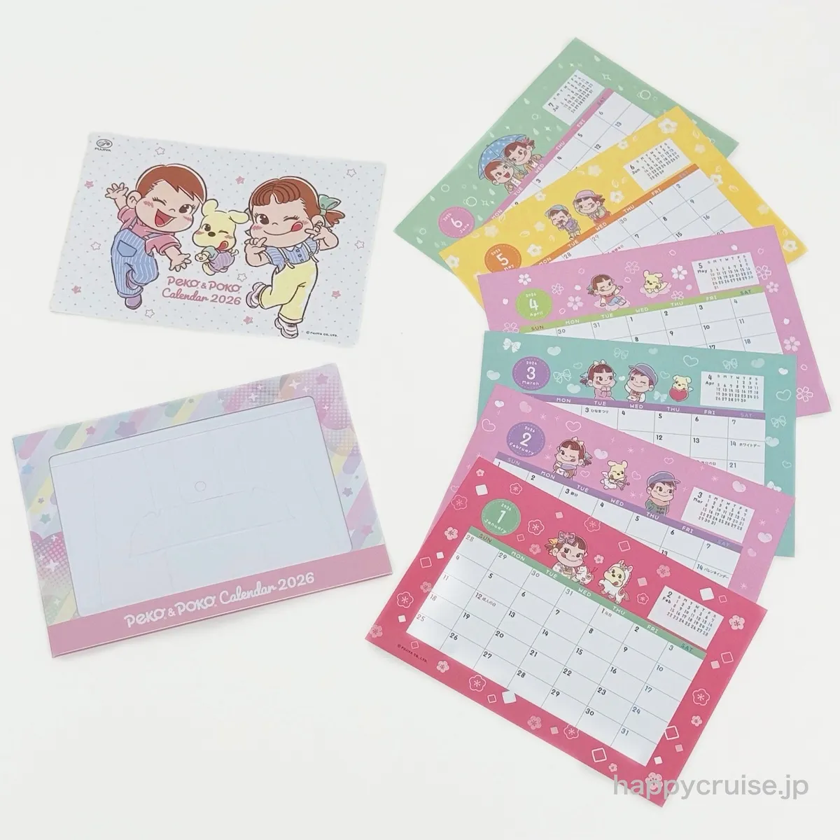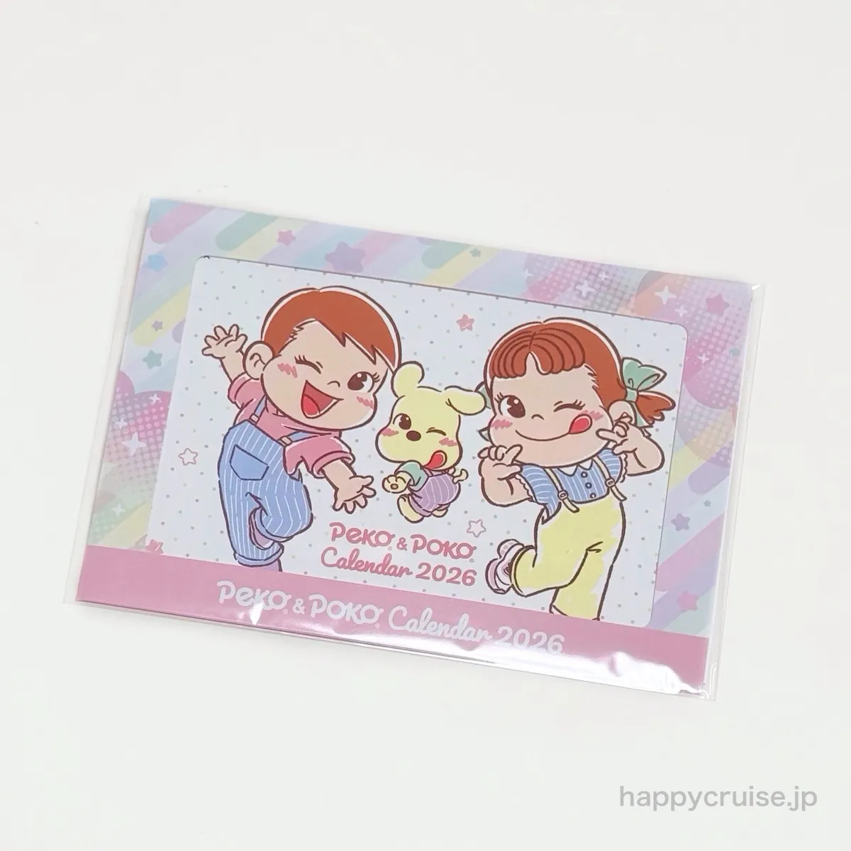 元気いっぱい、おしゃれをしたペコちゃんとポコちゃん、ドッグの絵柄がキュートな2026年カレンダー。