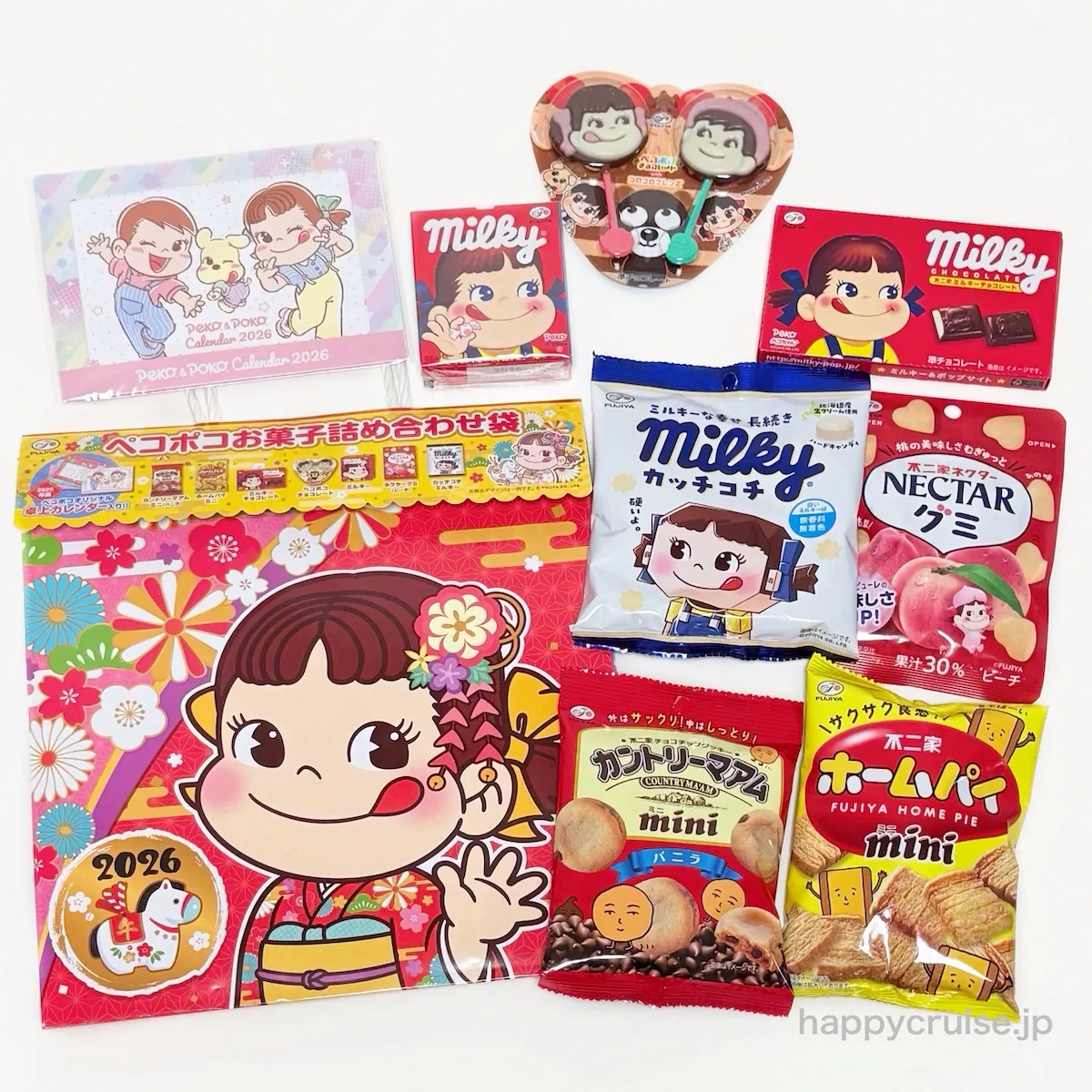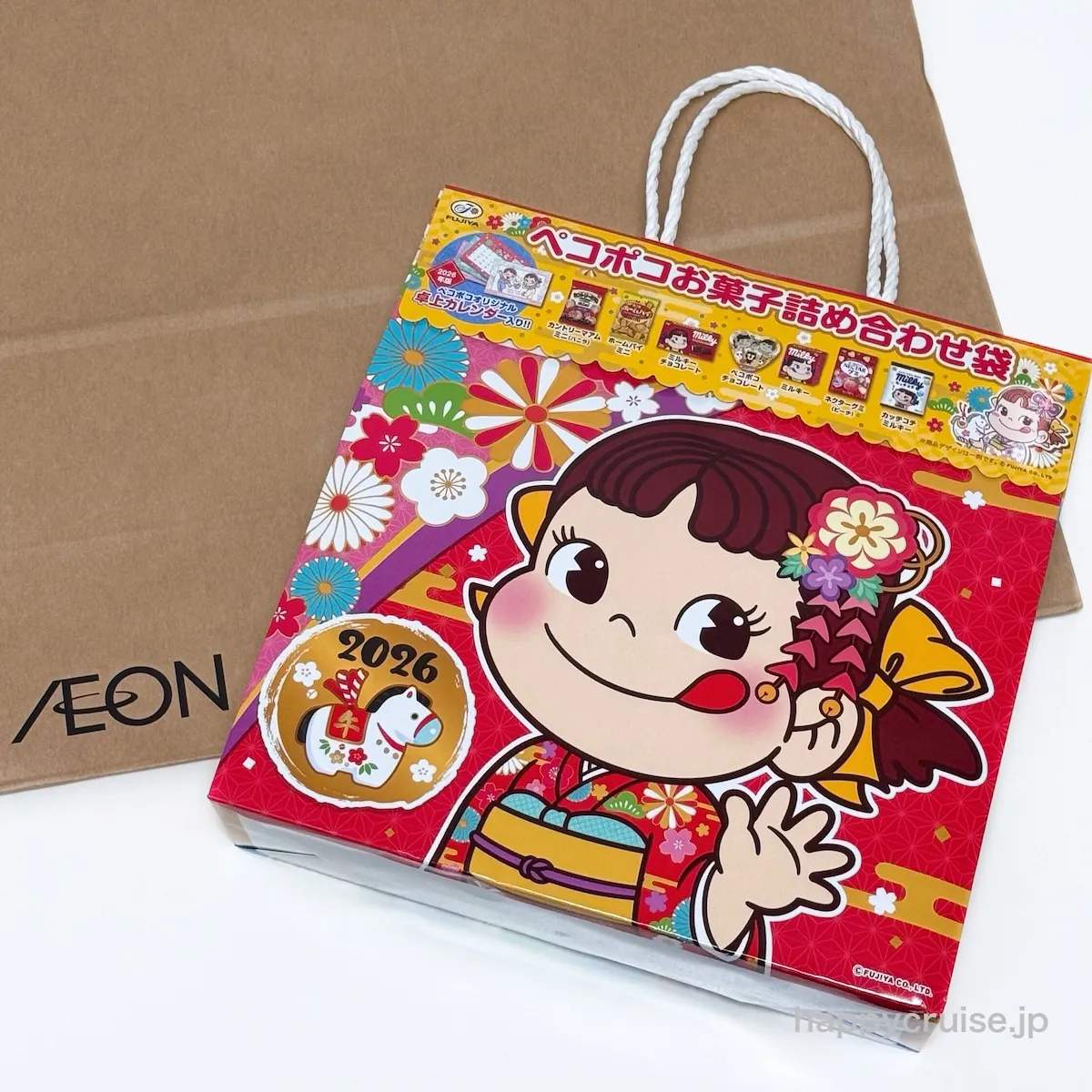 【ペコちゃん新春福袋2026】情報!イオンのお楽しみ袋コーナーで見つけた、不二家ペコちゃんの福袋『不二家 ペコポコお菓子詰め合わせ袋』をご紹介。着物姿のペコちゃんが目印のお得で可愛い福袋ですので、ぜひチェックしてみてください。
