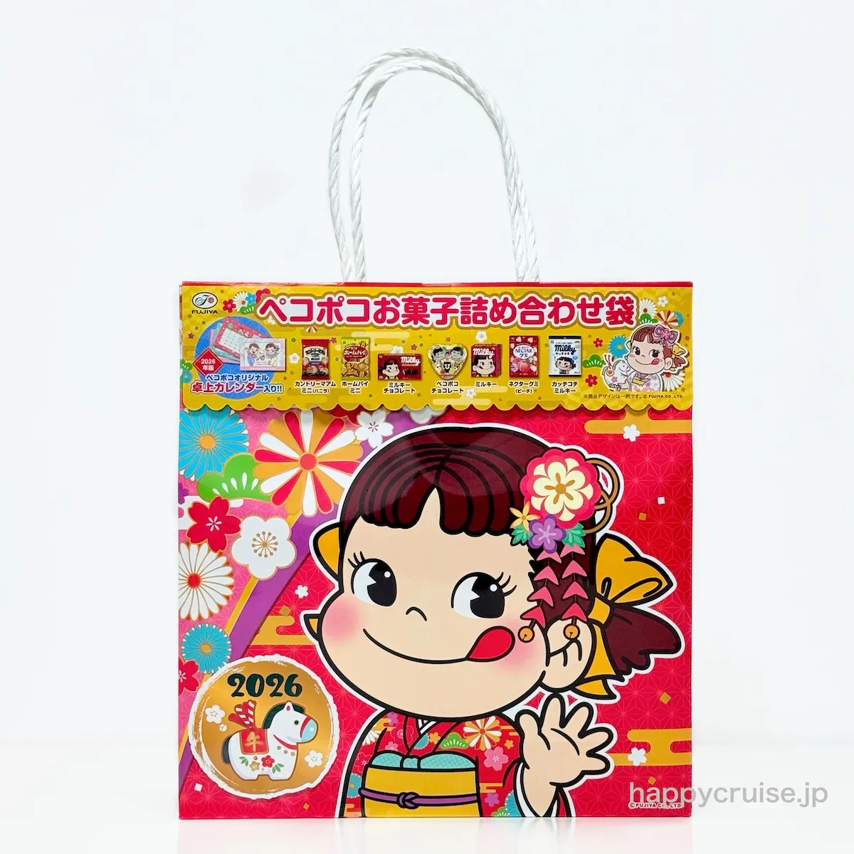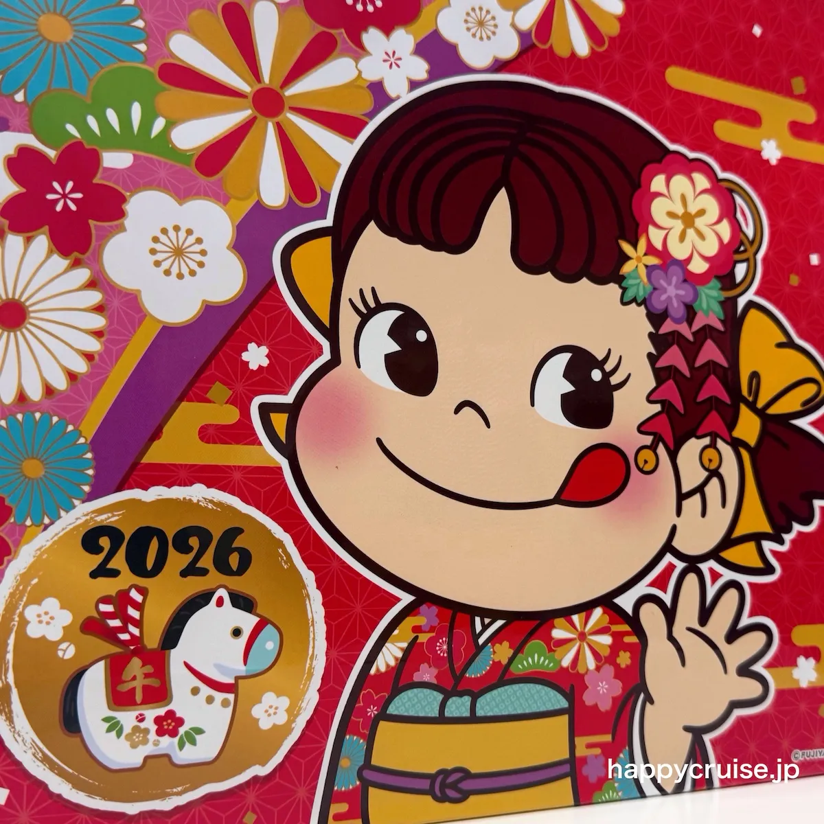 華やかな晴れ着姿のペコちゃんがとってもかわいい。2026年の干支(午)の絵柄もあしらわれていて、縁起の良さもUP!