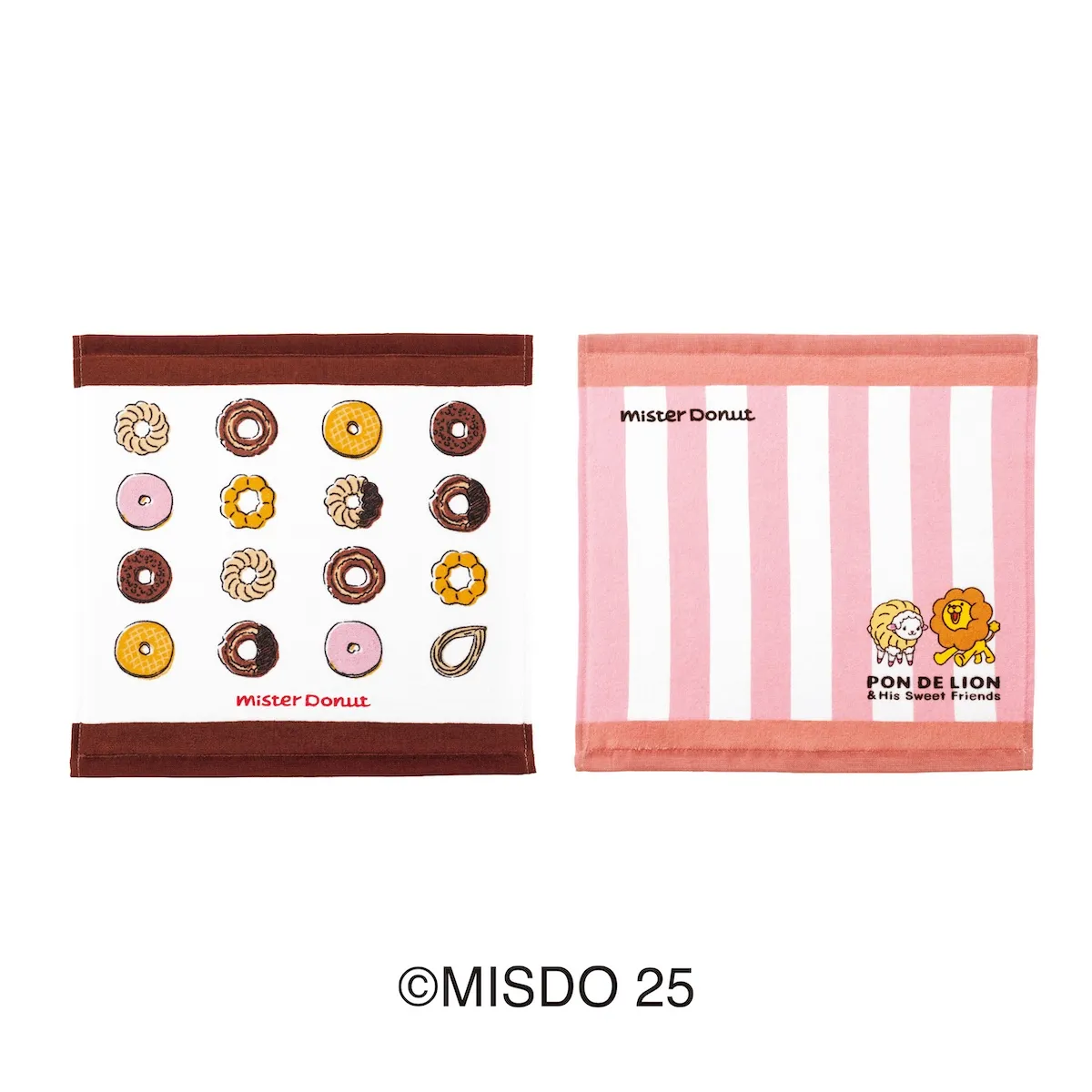 ポン・デ・ライオンとフレンチウーラーがかわいいストライプ柄と、人気のドーナツがデザインされたドーナツ柄のハンドタオルの2枚セット。