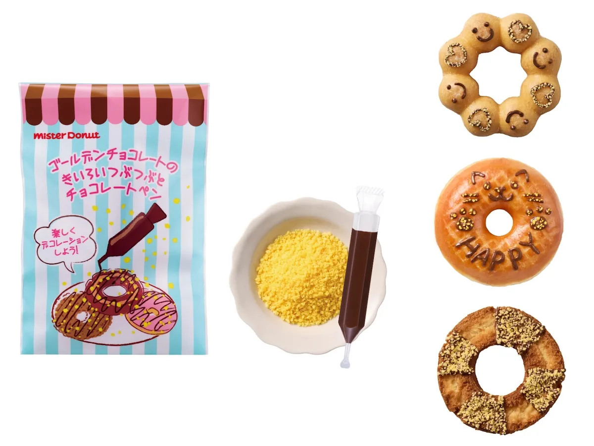 今回福袋として初登場となる「デコレーションキット」。人気ドーナツの「ゴールデンチョコレート」のきいろいつぶつぶと、チョコレートペンがセットになり、お好きなドーナツにデコレーションができるグッズです。