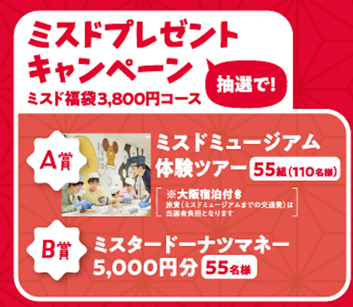 A賞 ミスドミュージアム体験ツアー (55組 110名様)※大阪宿泊付き