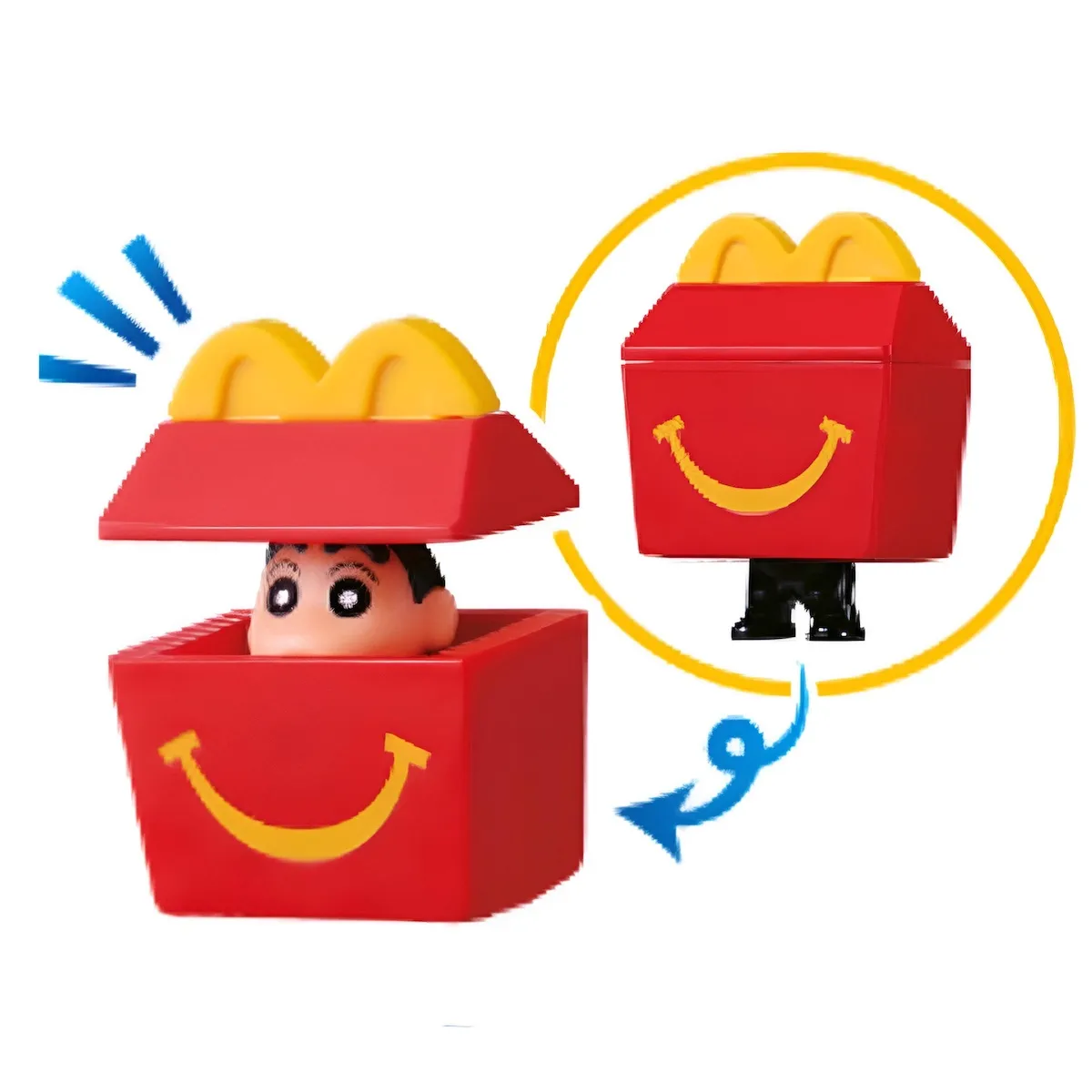 ハッピーセットボックスを置いて、下に押すと中からしんちゃんがひょっこり登場。思わず何度も押したくなる可愛さで、小さなお子さんにも楽しみやすいシンプルな仕掛けが魅力。