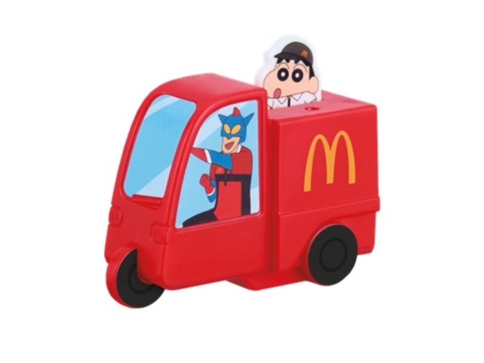 クルー姿のしんちゃんが乗ったデリバリーバイクのおもちゃ。手で押して転がすと、しんちゃんが上下に動く仕掛け付き。「いくゾ!アクション仮面!」マックデリバリーごっこが楽しめます。