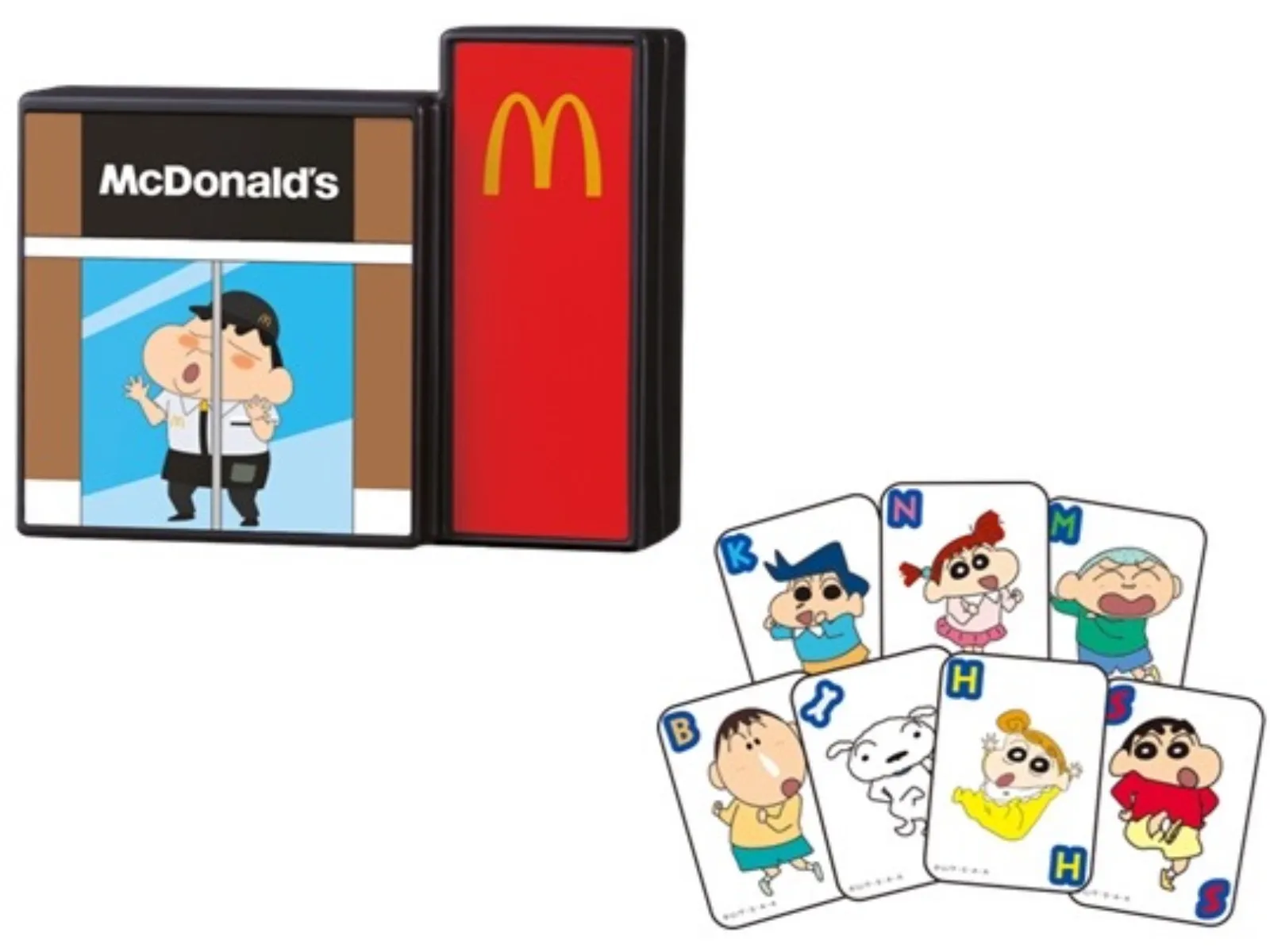 マクドナルド店舗型ケースの中に、なんとカードが14枚も!クルーの格好をしたしんちゃんのカードを並べたら、2枚ずつめくって同じ絵柄を探すゲーム。当たったらうれしい!オラすごぉ〜い☆