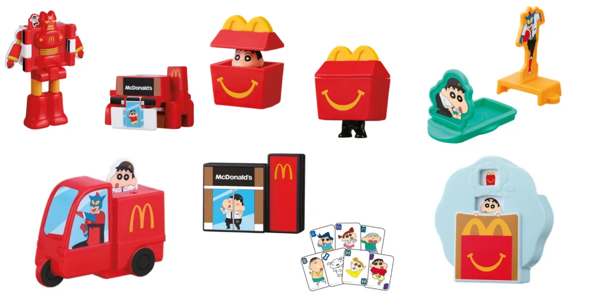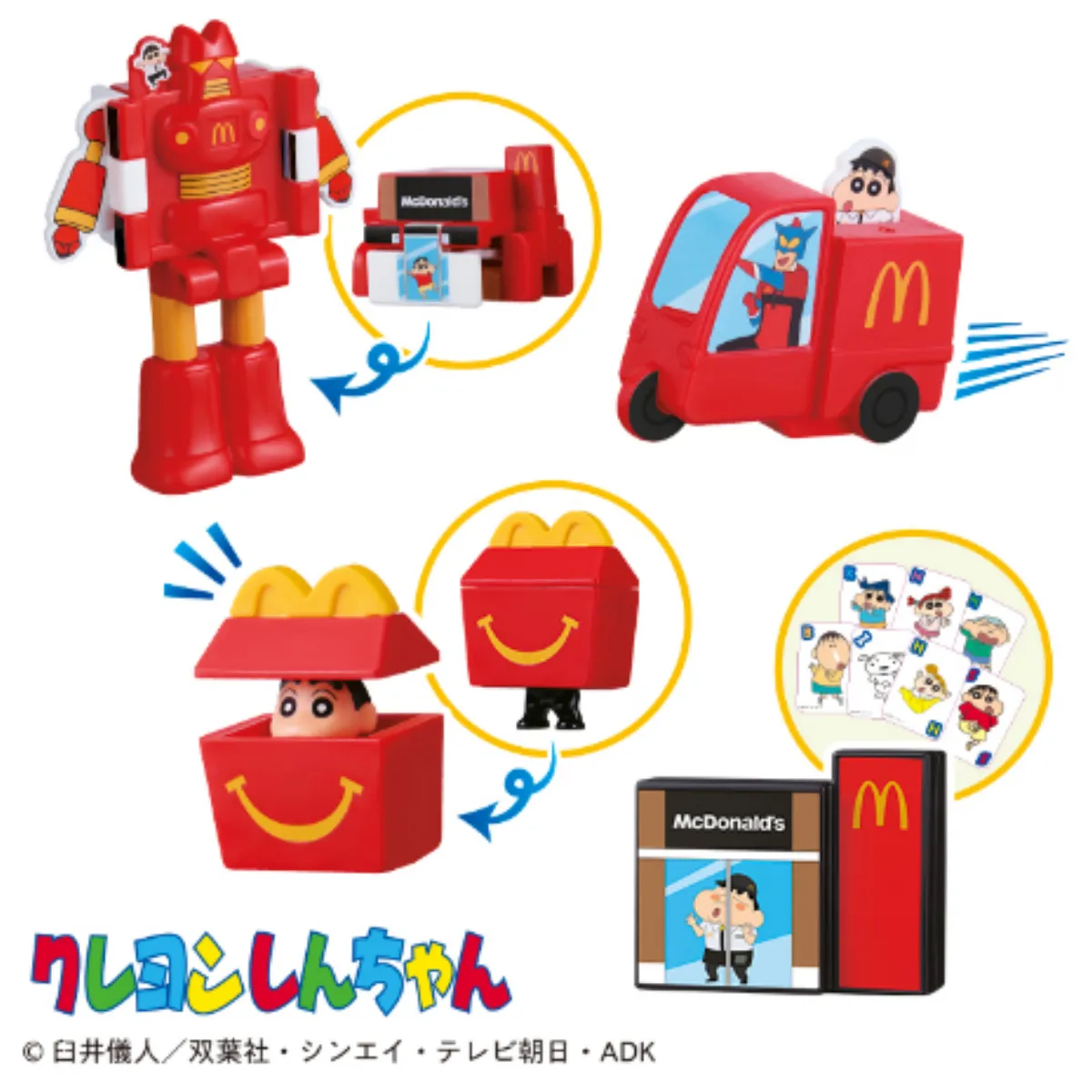 クルー姿のしんちゃんがヒーローたちと一緒に、マクドナルドのお仕事で活躍!しんちゃんの想像世界を再現した、おもちゃ全6種がハッピーセットに登場!