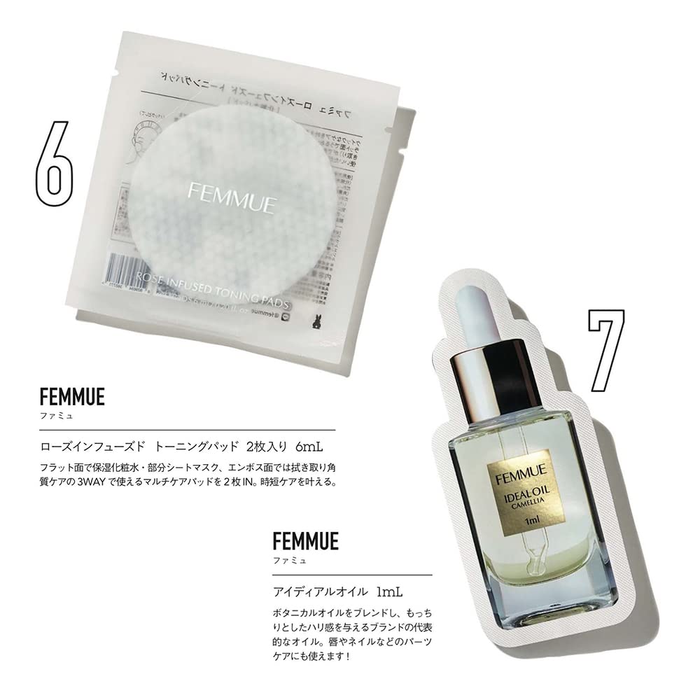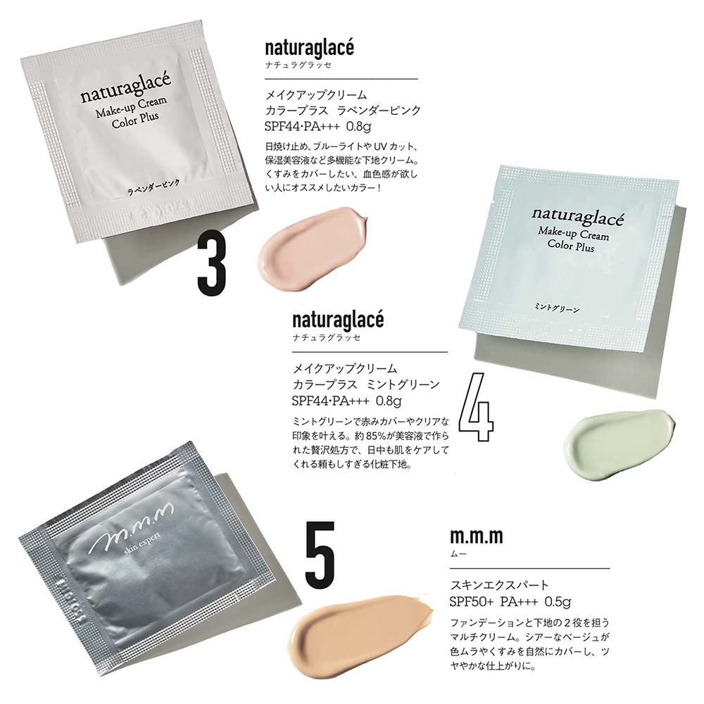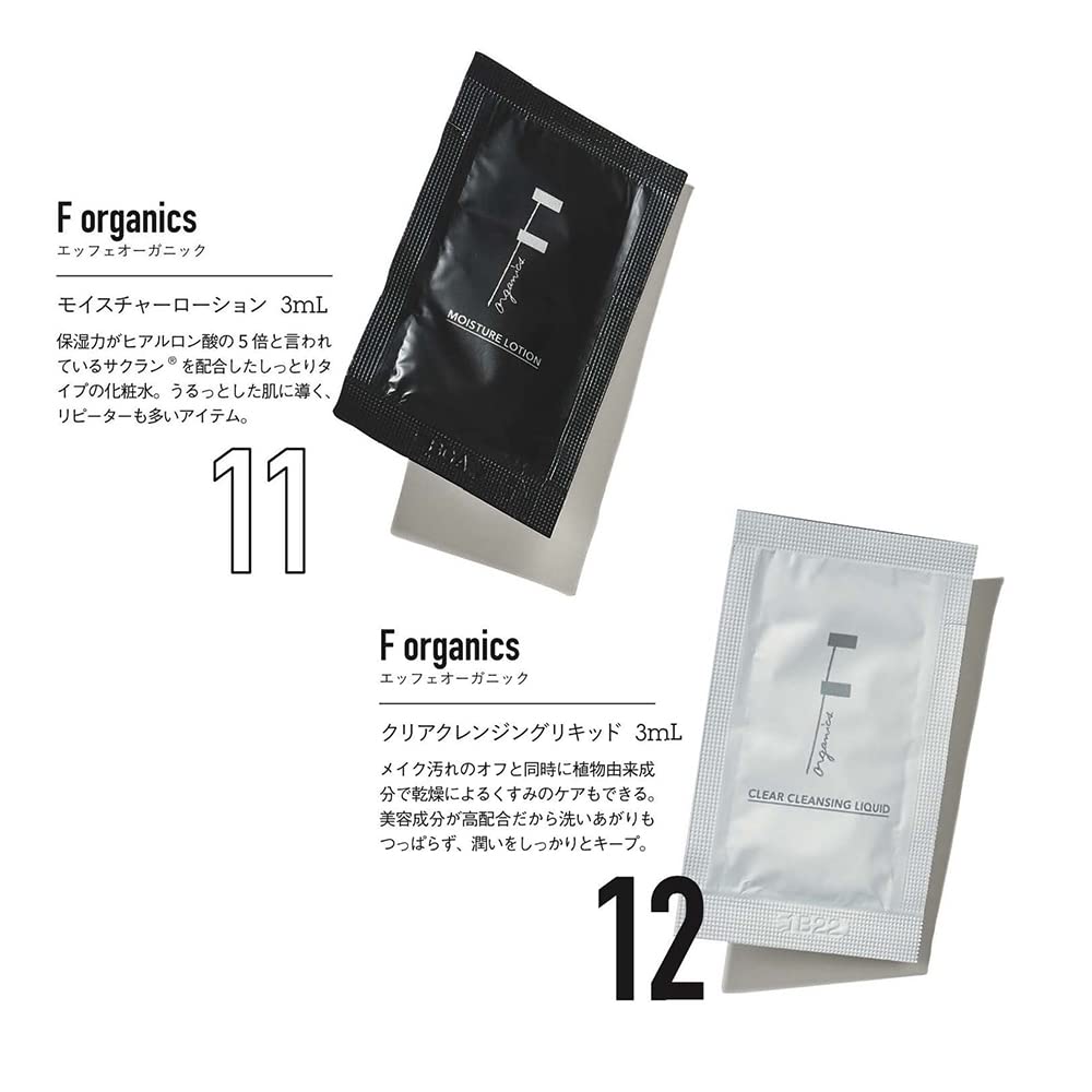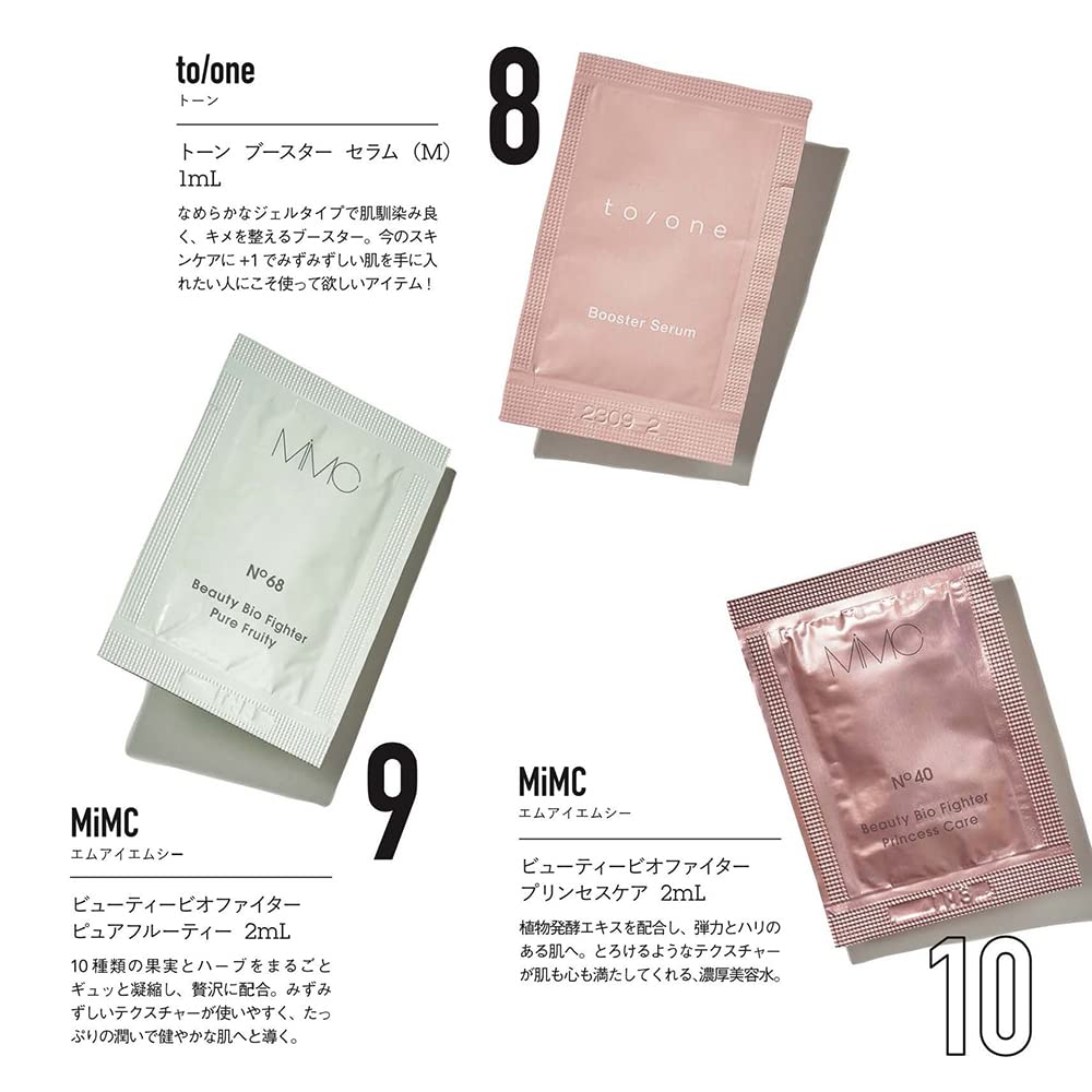| 特別付録 | 全12点の超豪華セット 1. to/one(トーン) トーン ネイル ポリッシュ 09 ミニボトル 4mL (非売品サイズ) 2. ONLYMINERALS(オンリーミネラル) ミネラルエッセンスBBクリーム オークル 10g(非売品サイズ) 3. naturaglace(ナチュラグラッセ) メイクアップクリーム カラープラス ラベンダーピンク サシェ 4. naturaglace(ナチュラグラッセ) メイクアップクリーム カラープラス ミントグリーン サシェ 5. m.m.m(ムー) スキンエクスパート サシェ 6. FEMMUE(ファミュ) ローズインフューズド トーニングパット 2枚入り 7. FEMMUE(ファミュ) アイディアルオイル サシェ 8. to/one(トーン) ブースター セラム (M) サシェ 9. MiMC(エムアイエムシー) ビューティービオファイター ピュアフルーティー サシェ 10. MiMC(エムアイエムシー) ビューティービオファイター プリンセスケア サシェ 11. F organics(エッフェオーガニック) モイスチャーローション サシェ 12. F organics(エッフェオーガニック) クリアクレンジングリキッド サシェ |